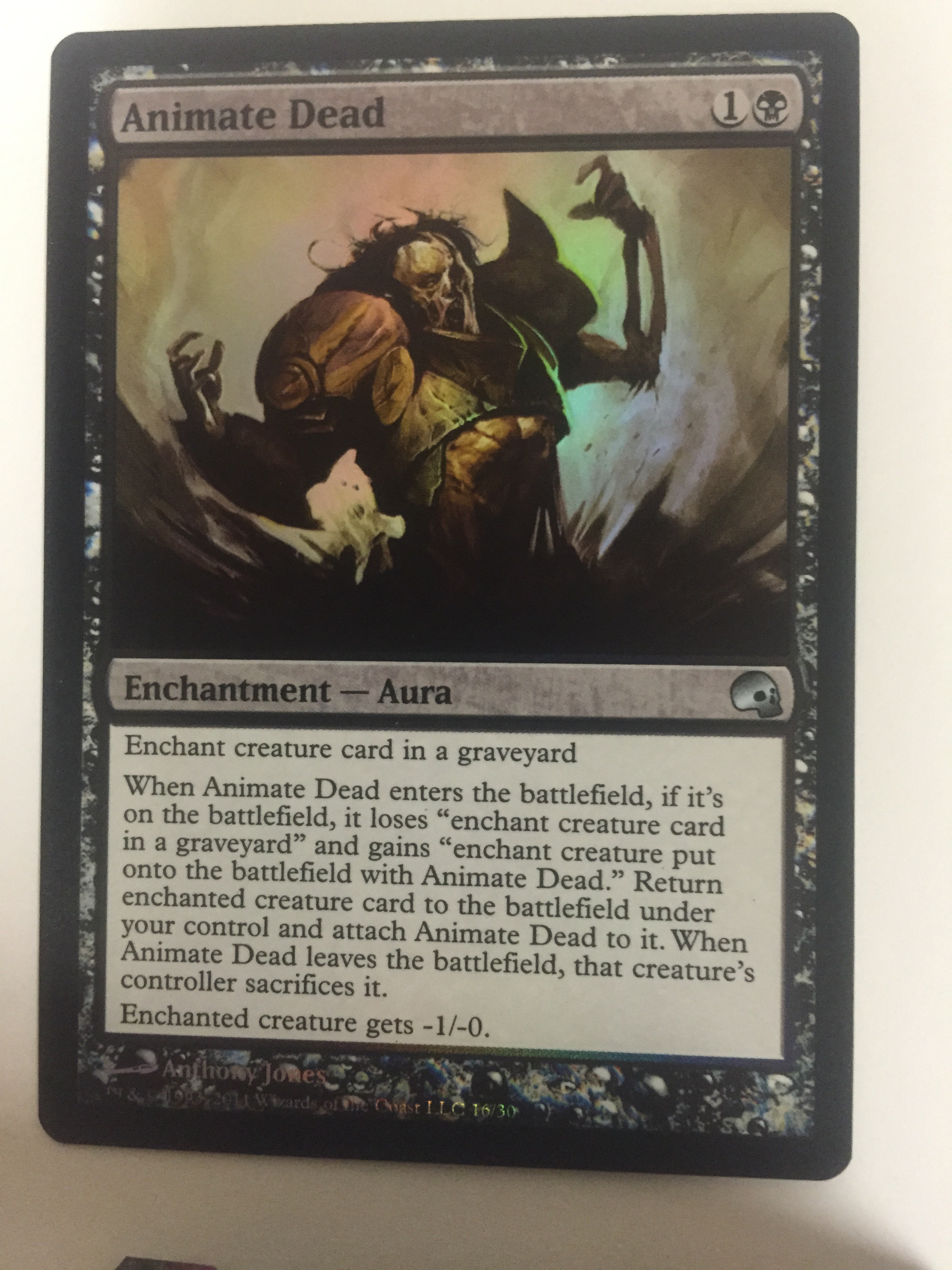 Animate Dead is an odd card with a contentious history. Evidently an aura can’t attach to things in the graveyard…