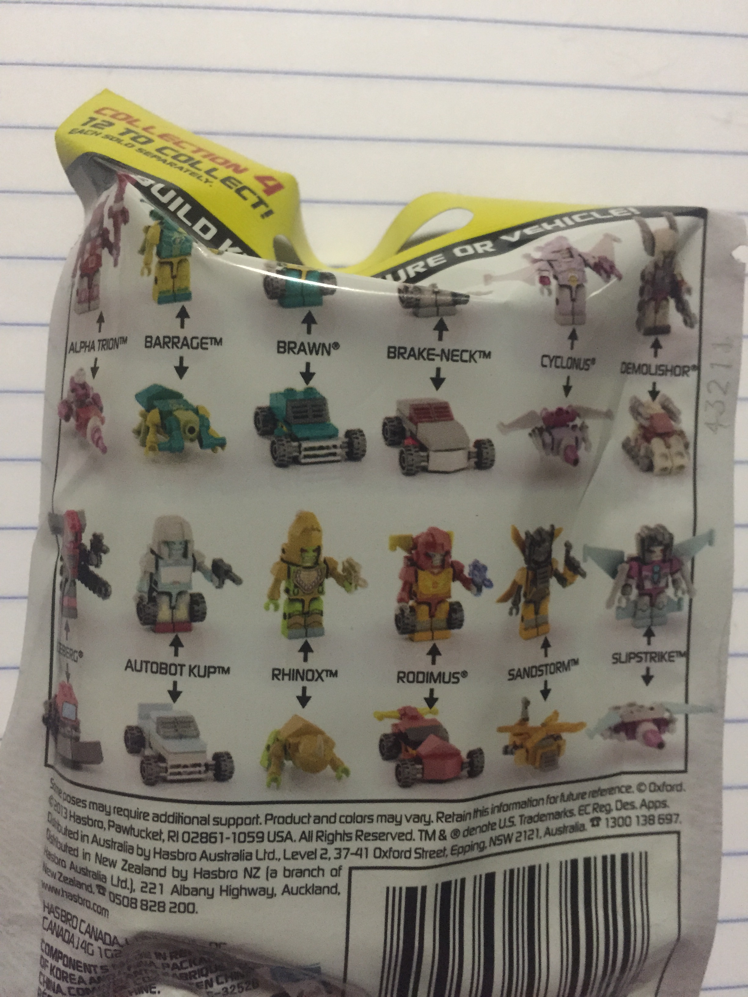 The back of the bag looked like this…featuring many transformers…most of whom I have little knowledge of or care for. Rodimus Prime was among them, making me think these must be Transformers from season three of the Generation One cartoon. (Longtime readers will know that I never cared much for Rodimus Prime.)
