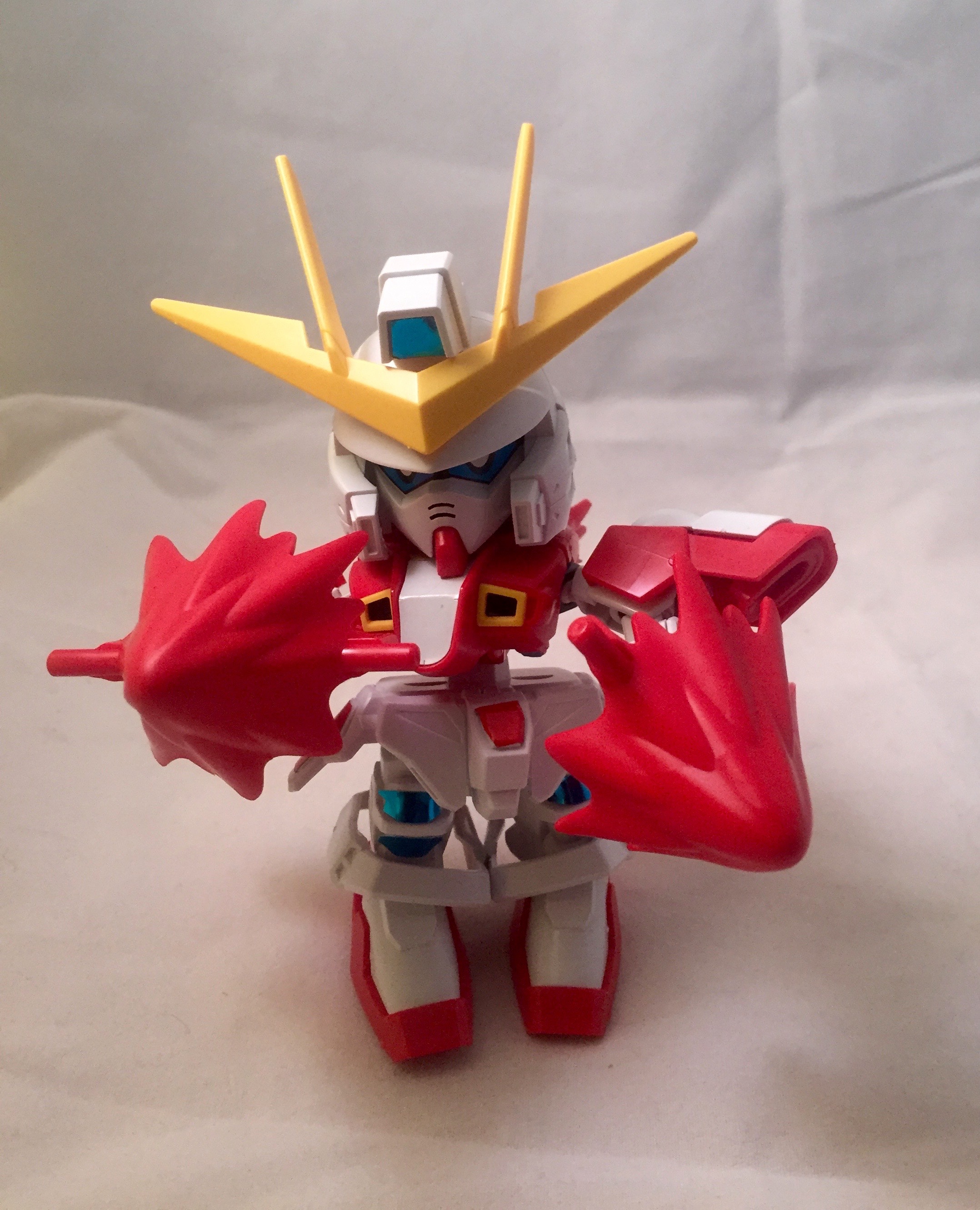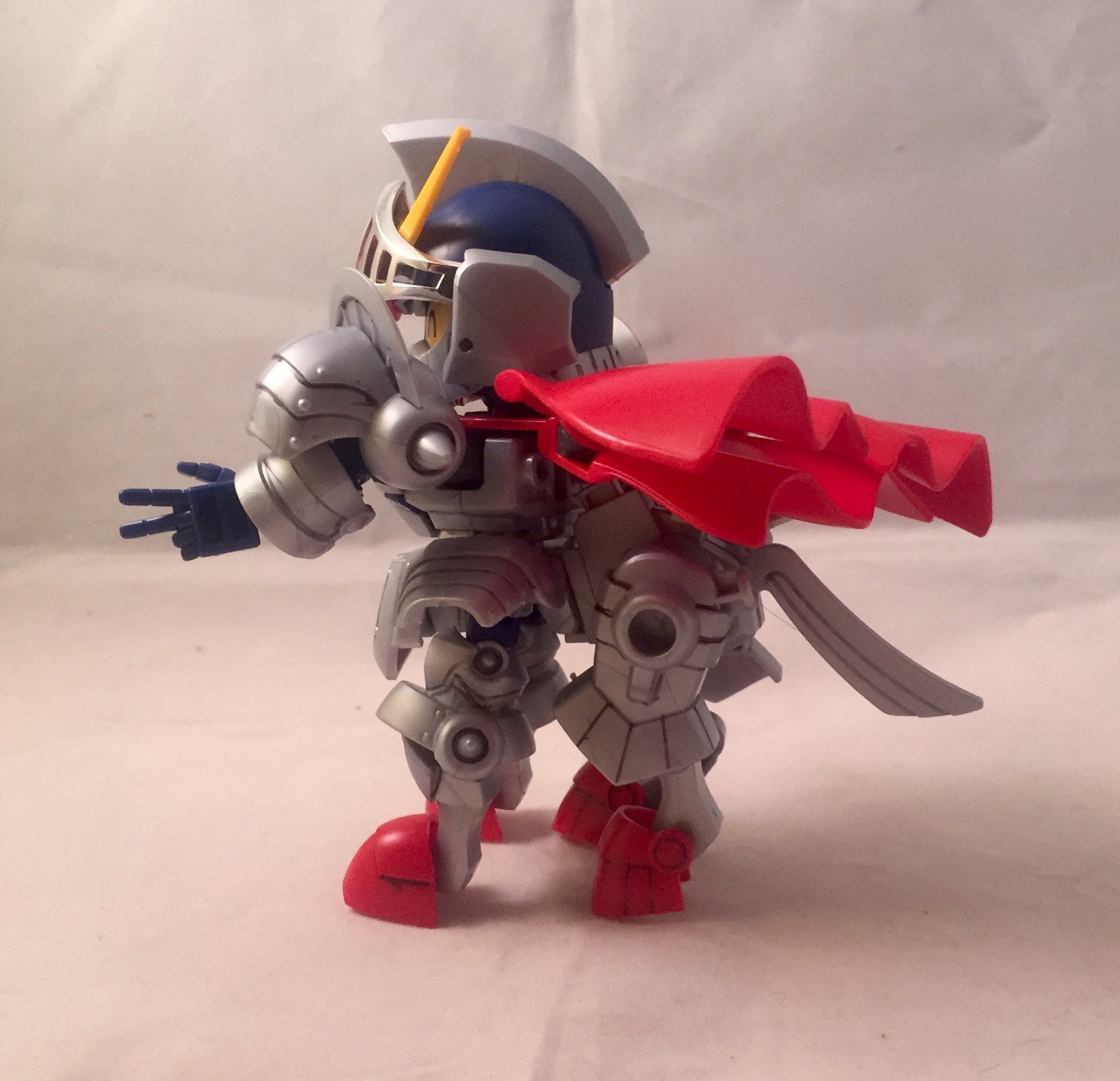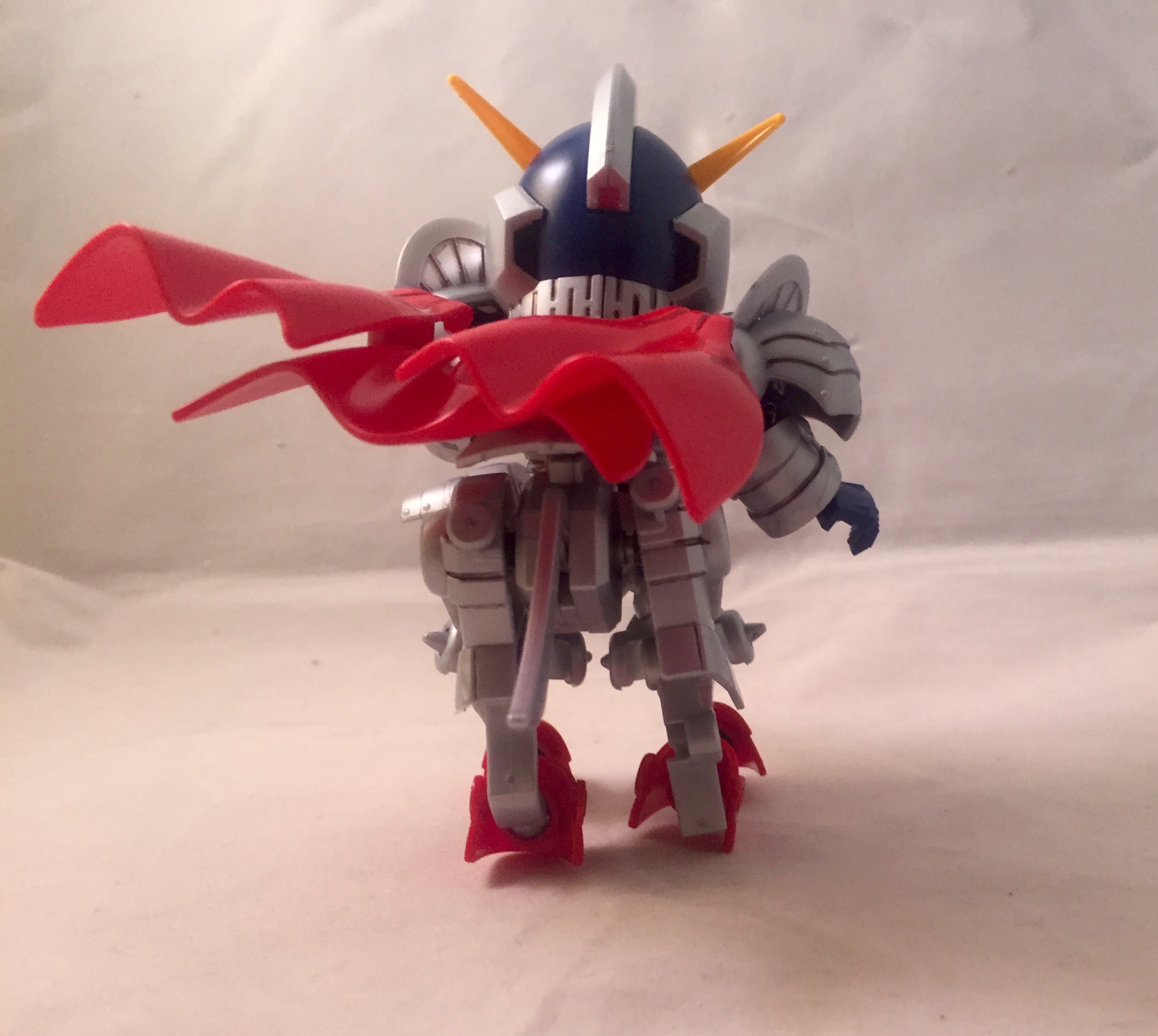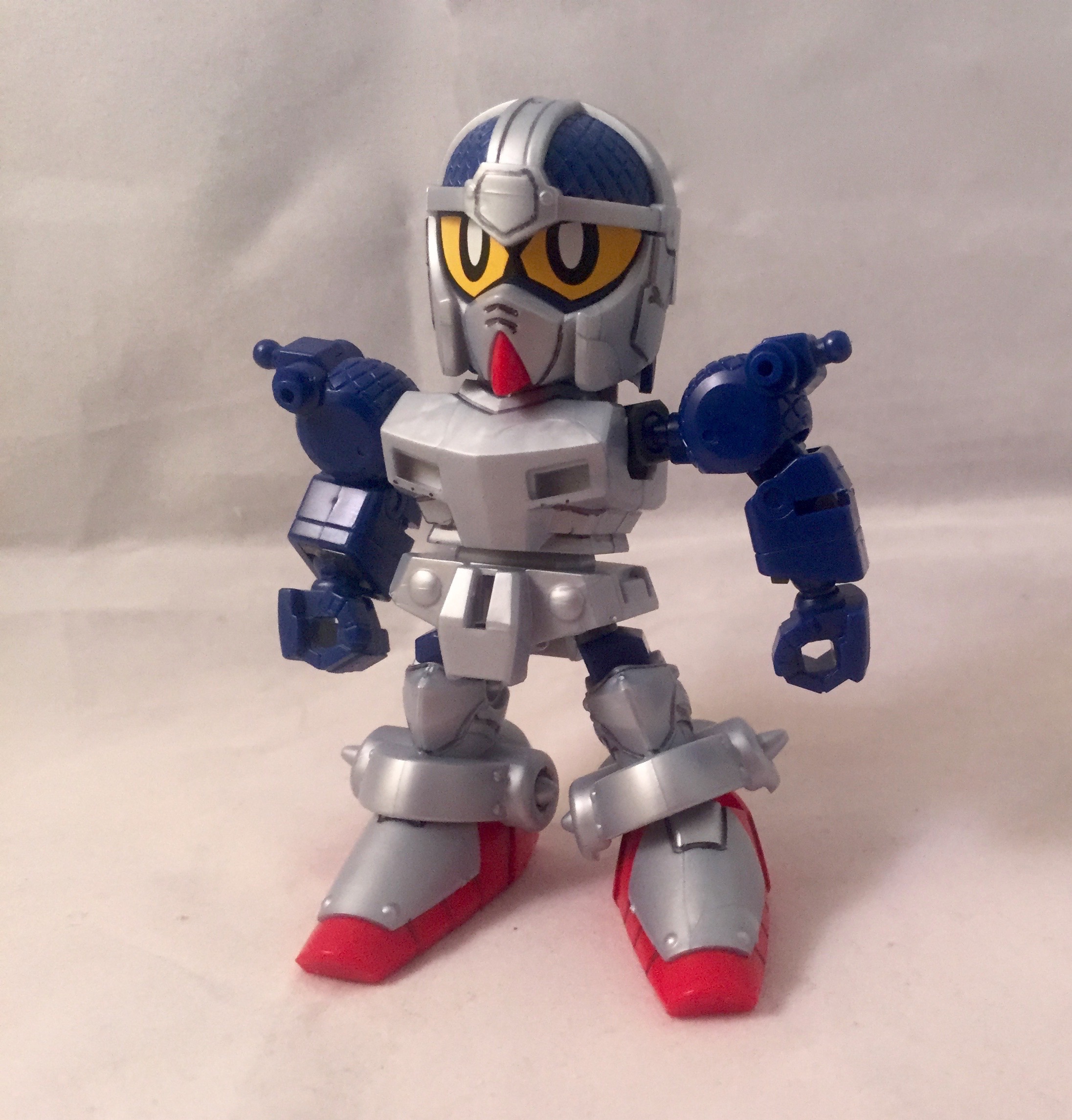 Sure, it has some problems. The helmet doesn’t like to stick to the single stud on top of his head. He stands better without the stand…both feet don’t want to plug into it. (That’s why you saw me posing him standing on one foot.) There is ugly branding on the underside of one of the wings.