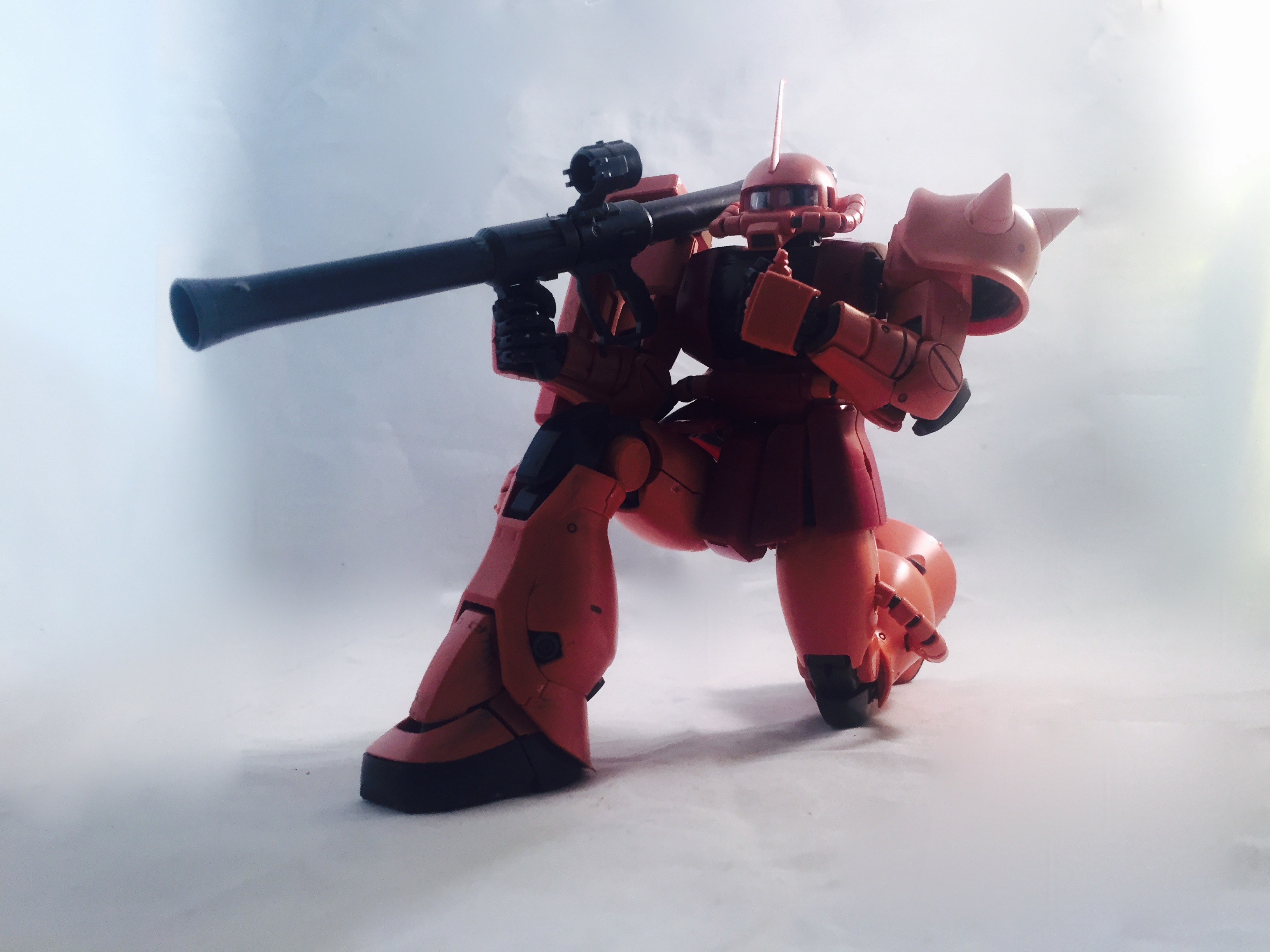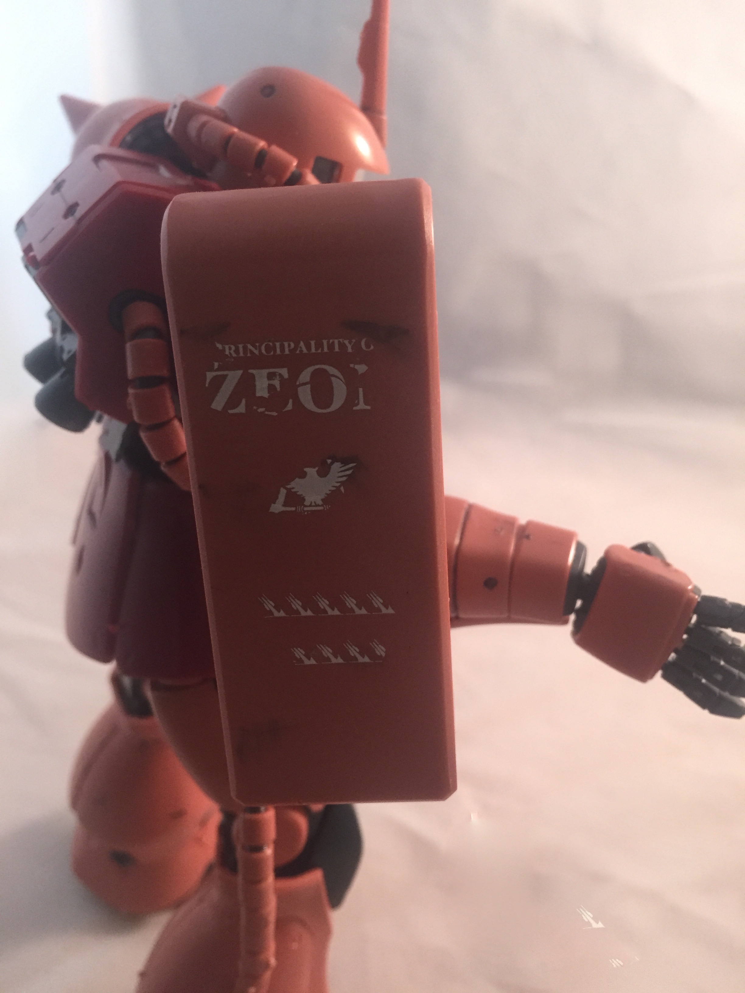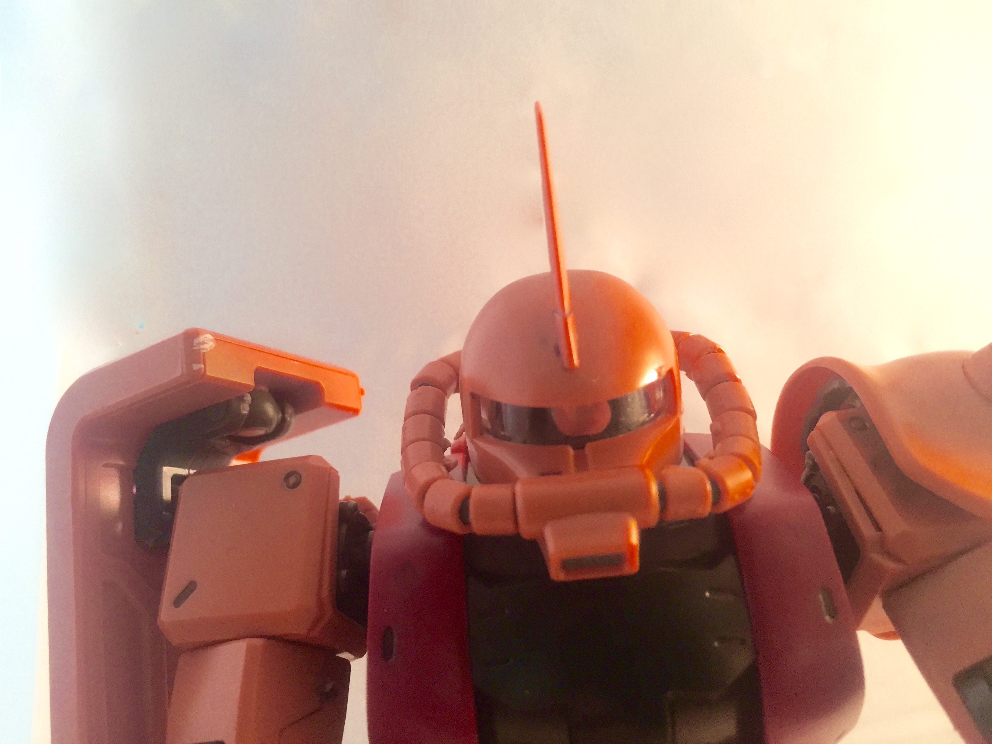 The cockpit opens, revealing Char Aznable inside. The cockpit is surrounded by yellow “psycho-frame” components. The Gundam came with two different pilots. One to stand beside on display, and one to stay in the cockpit. The SpartanTeen (nor the SpartanNerd) can paint the tiny details required….We would if we could. But that is a little out of our skill level at this point.