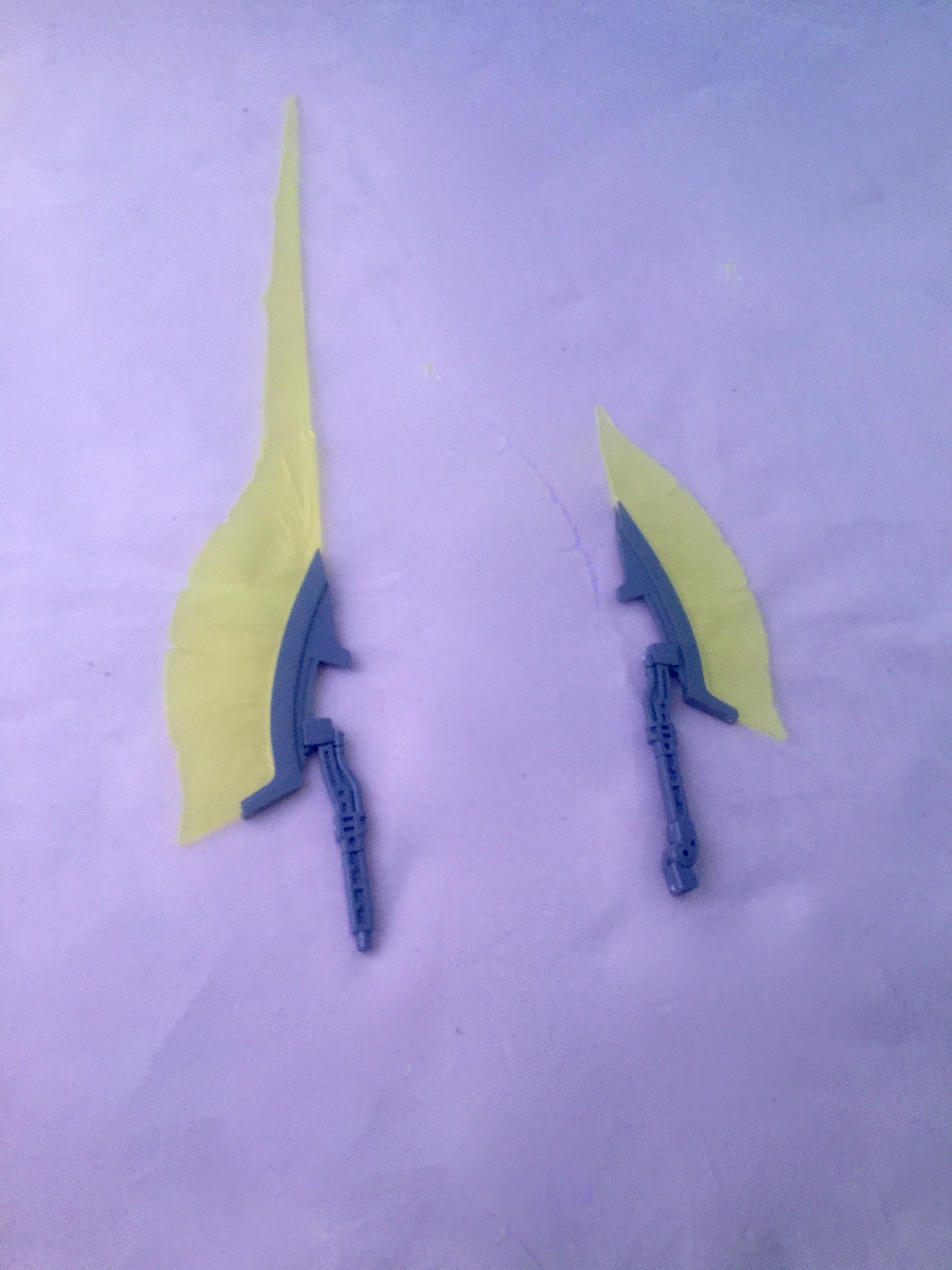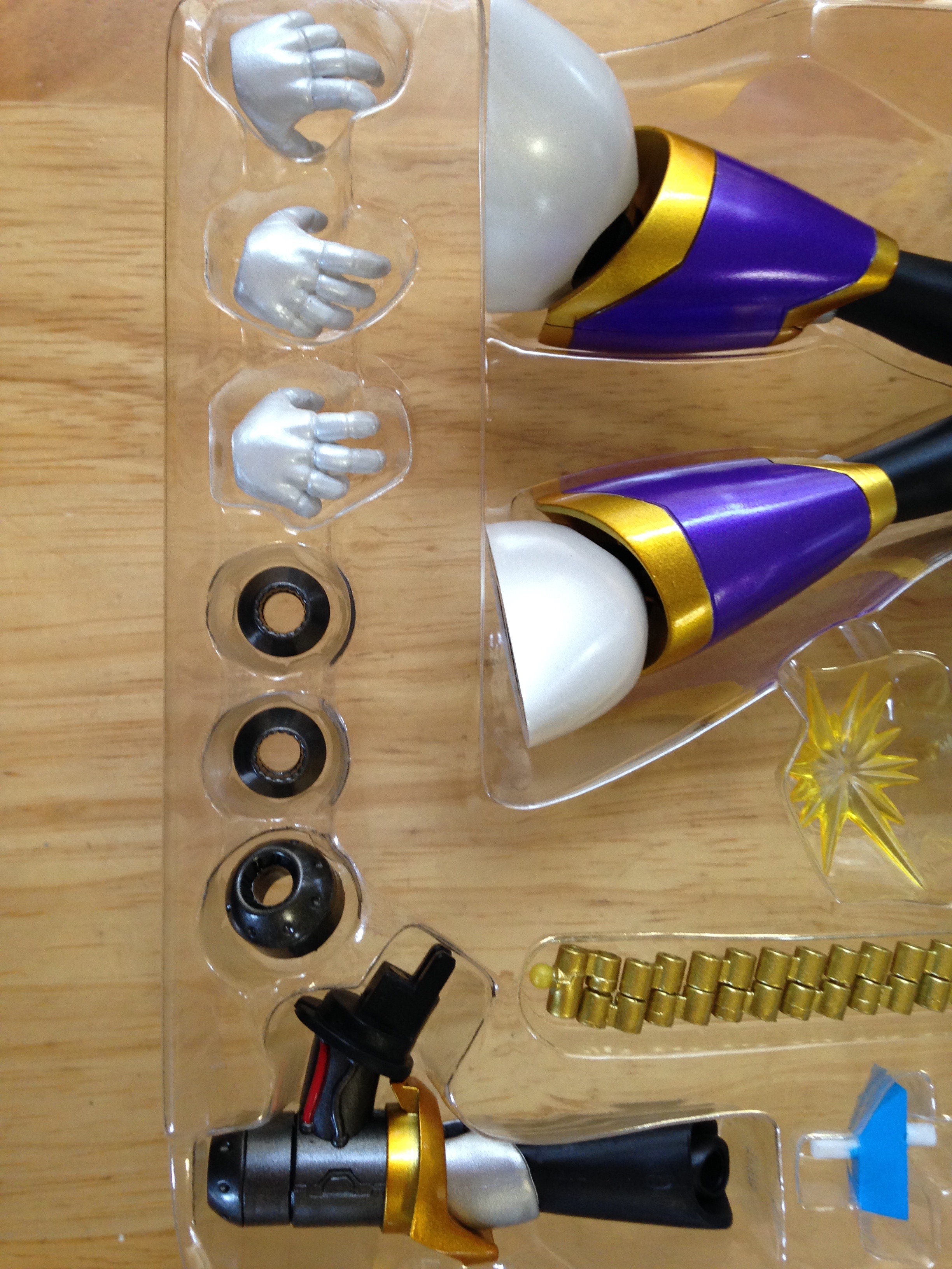 Here are most of the accessories. I say most, because, the Grenade Launcher/Shotgun wasn’t ready at the time of the review. Notice the “beam-effect” parts. These are interchangeable with the axe, and with the shield.
