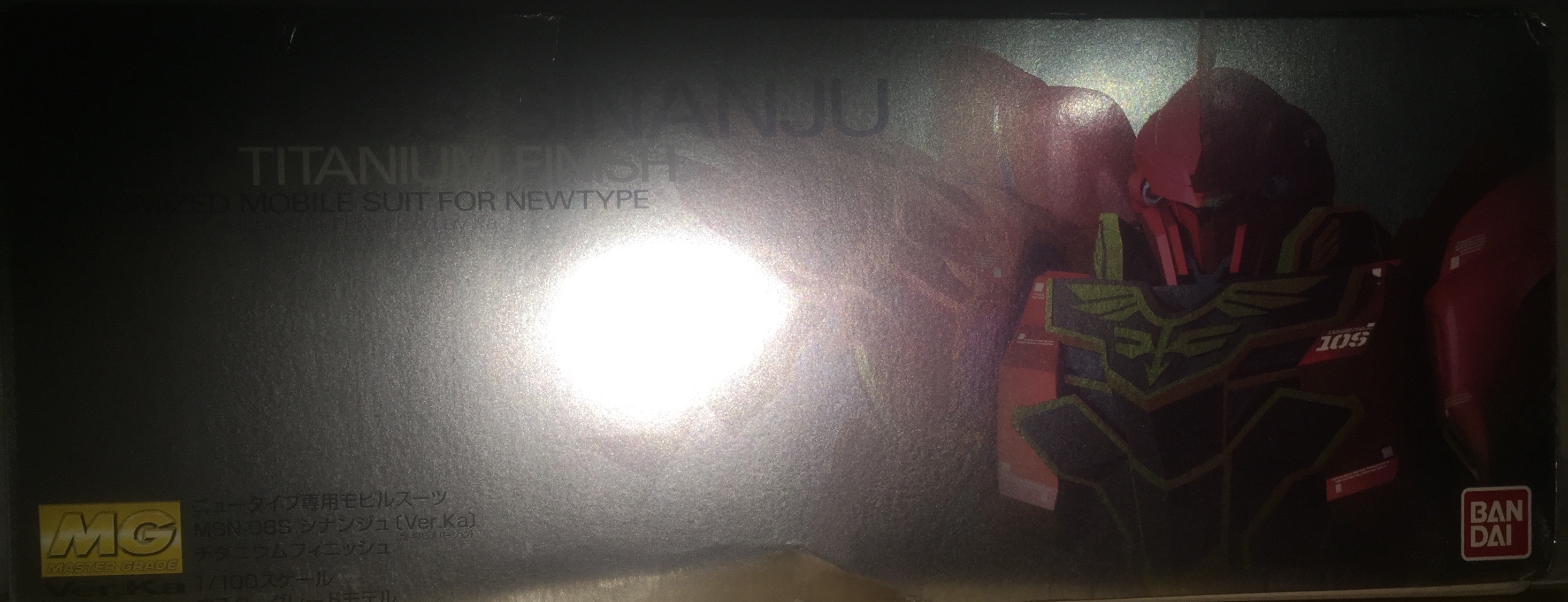Of all of the Gundams we have reviewed, the Sinanju is the most impressive. In several ways. This Gundam has a “titanium finish,” basically vac-metal plastic. It makes it shine! Combine this effect with the size of the figure at Master Grade 1/100 scale and the many accessories and even an additional stand, and you have an incredible item. Above is the box. And longtime readers know that the SpartanNerd really likes his foil!