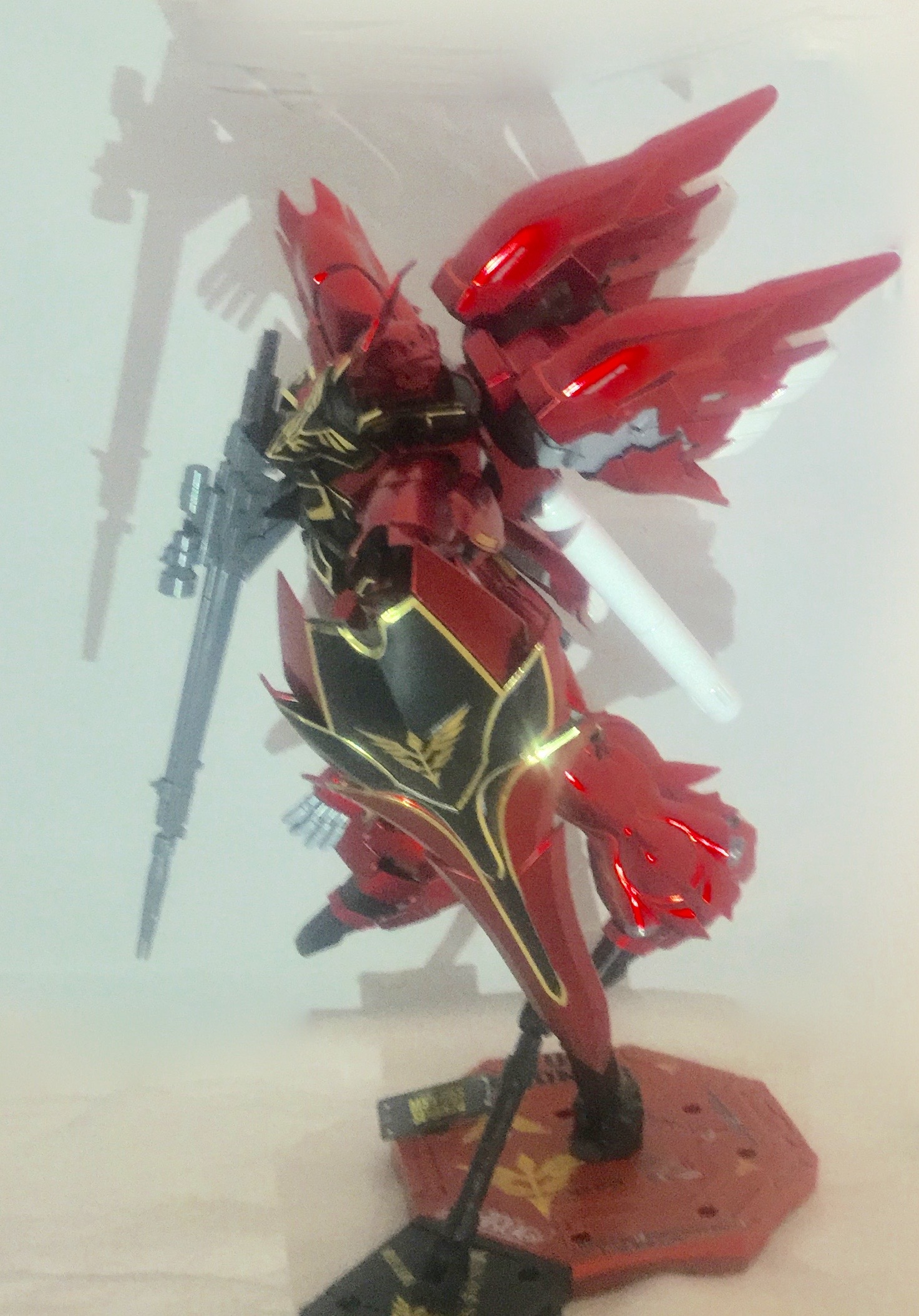 Here the Sinanju stands, unarmed, and without his backpack. It is very articulated. The fingers all move like human fingers. The arms move like a humans, the legs move like a humans. It is a “super-articulated” design. The shoulder armor and knee armor move to accommodate the most articulation.