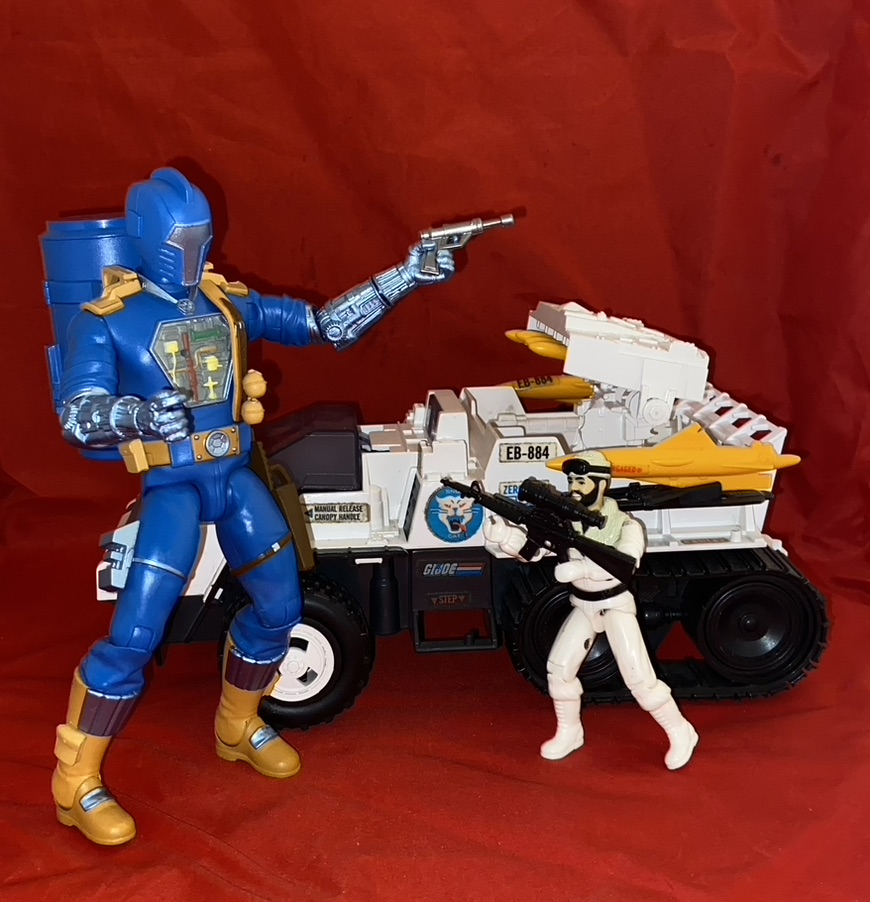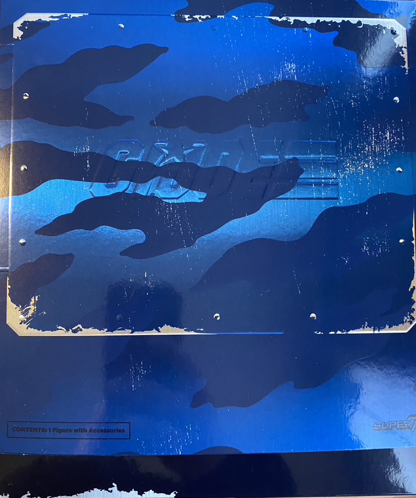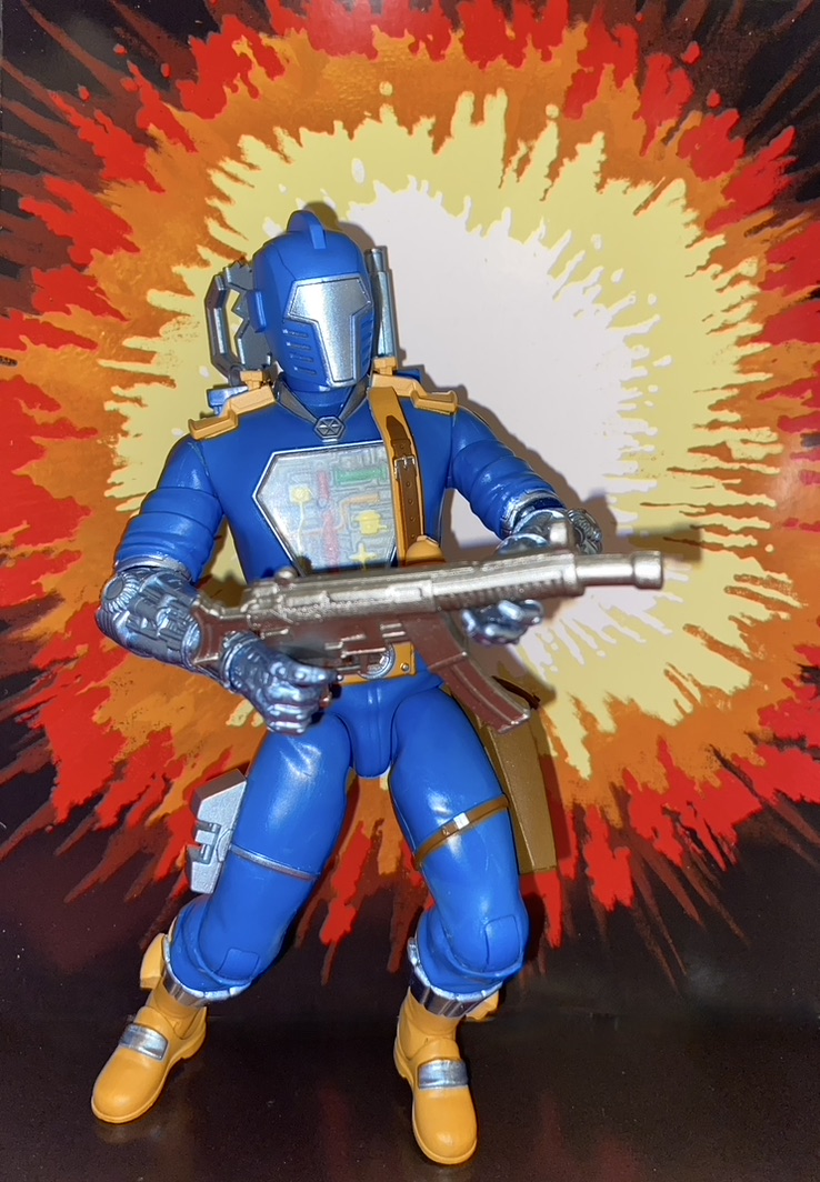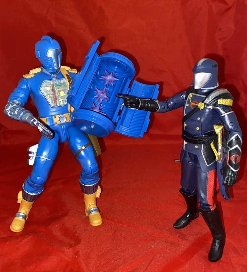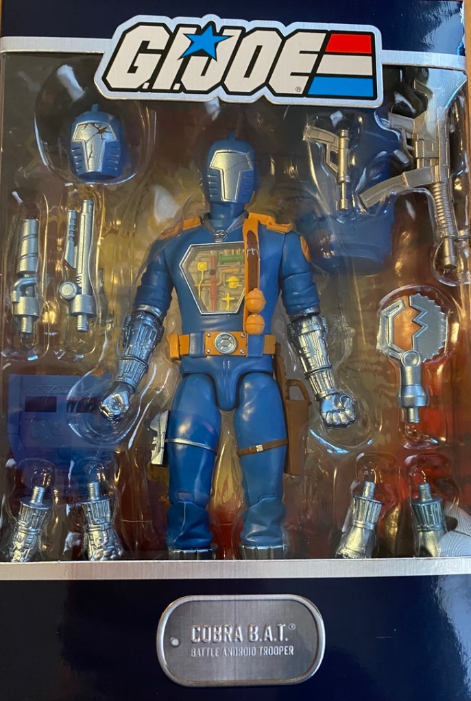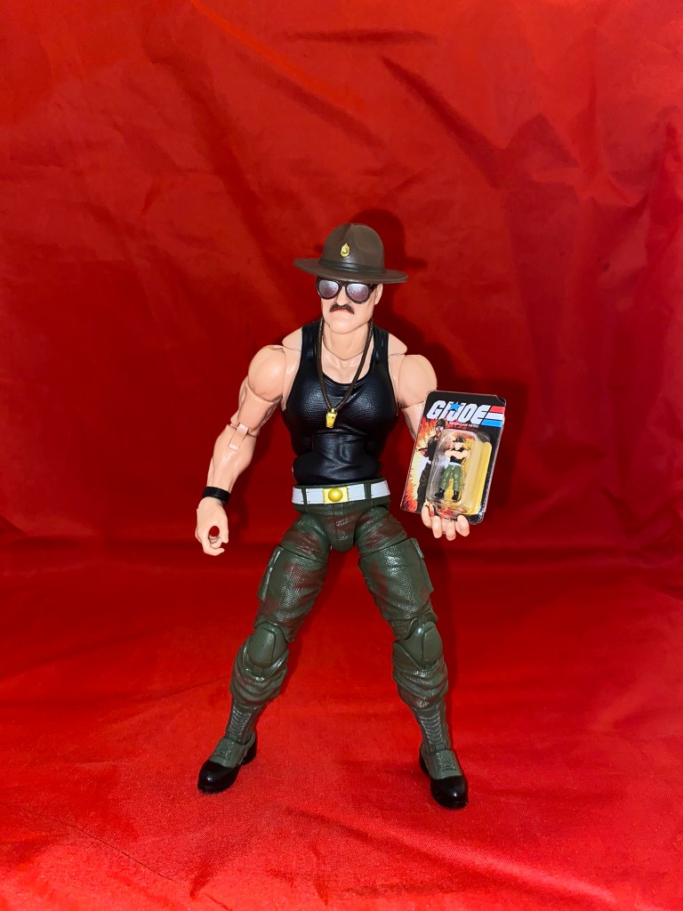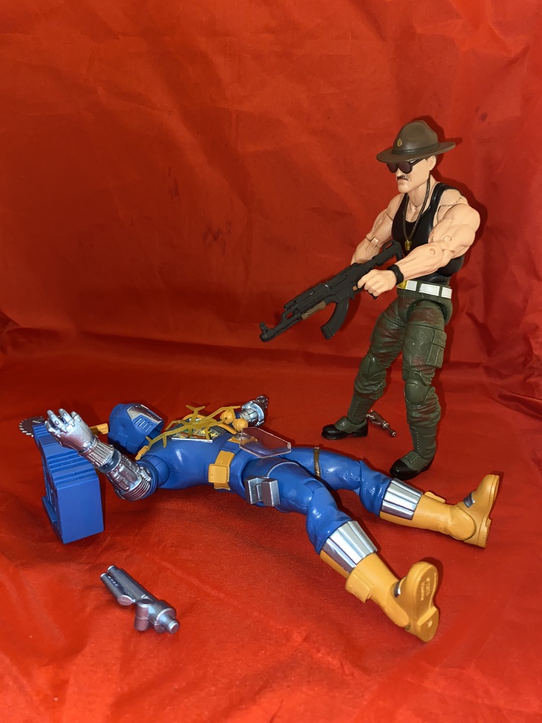 Here I have him posed with the GI Joe classified figures. You would think the scale discrepancy would be jarring, but in this case it really isn’t. Maybe Cobra Commander is a Napoleon type? Maybe Battle Android Troopers should be on the taller and bigger side. Sgt. Slaughter’s beefy sculpt offsets the tallness of the B.A.T. (What are the sparks in the barrel backpack? They are like sharp “devil-heads” and can be removed). The photos don’t show it much, but the Super7 figure does have larger feet and legs. I used the box background card (also removable!) to take the classic pic that looks like a vintage cardback. By the way. Why don’t GI Joe Classified figures contain this feature?