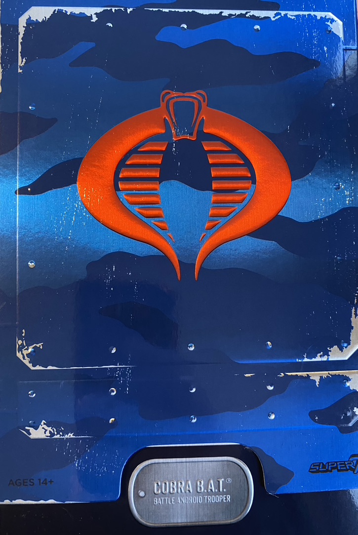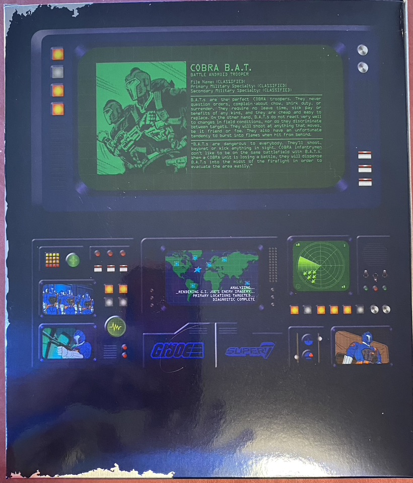 The Cobra B.A.T. came in a very nice package. I was totally floored at how nice this was! After opening Sgt. Slaughter, no comparison. This sleeve leaves me with a dilemma. I want the figure on display. But this part of the box, wow! It has this foil coloring, with Cobra blue camouflage designs, and silver outlines. Just this much did it for me. This puts Mattel’s MOTUC packaging to shame, and definitely puts the Hasbro windowless box to shame! When you remove the sleeve, you can see the figure still in a nice box, and you can read the details on the back. The back has this cartoonish robot feature with a screen that gives us what serves as a bio card for the Cobra B.A.T. Not a single person who purchased this would not know what the B.A.T… is about. But I paid $36 for this figure, and felt right away upon opening it that I was receiving a premium treatment. (Recently, the MEGA Snake Mountain box has underwhelmed me.)