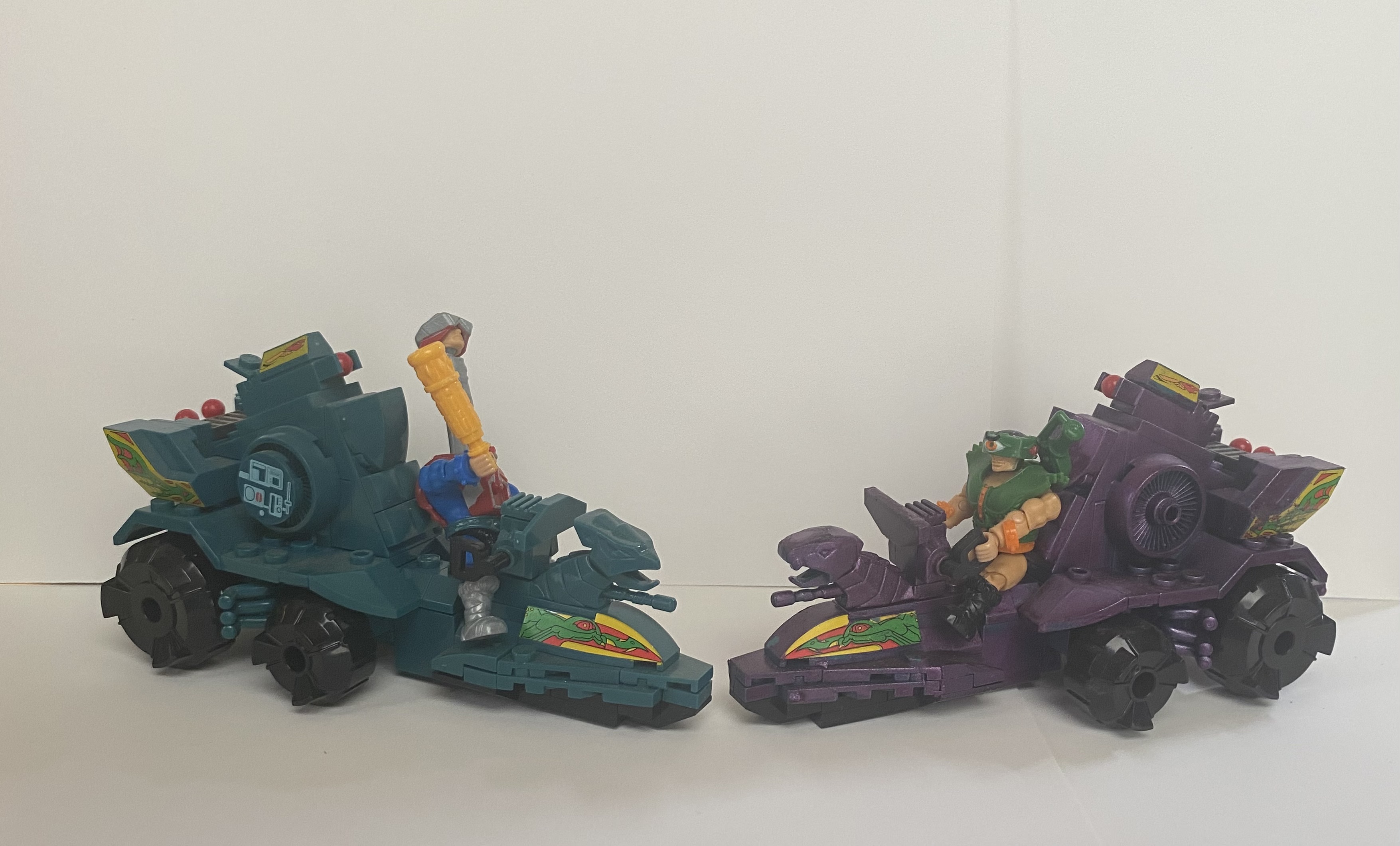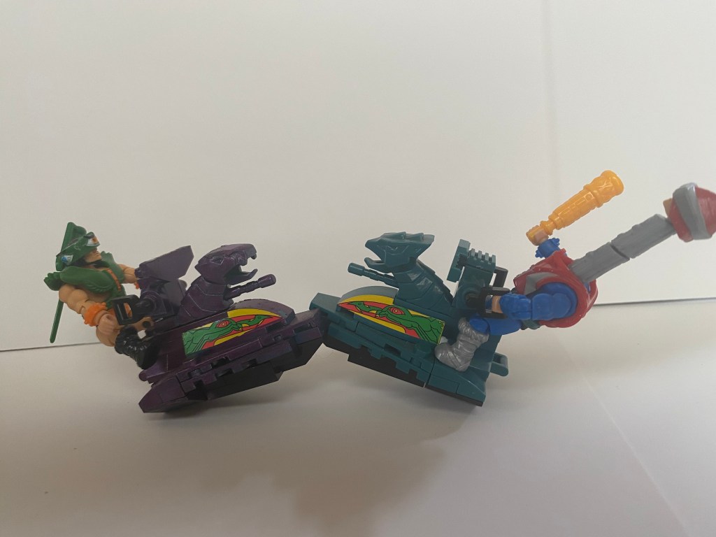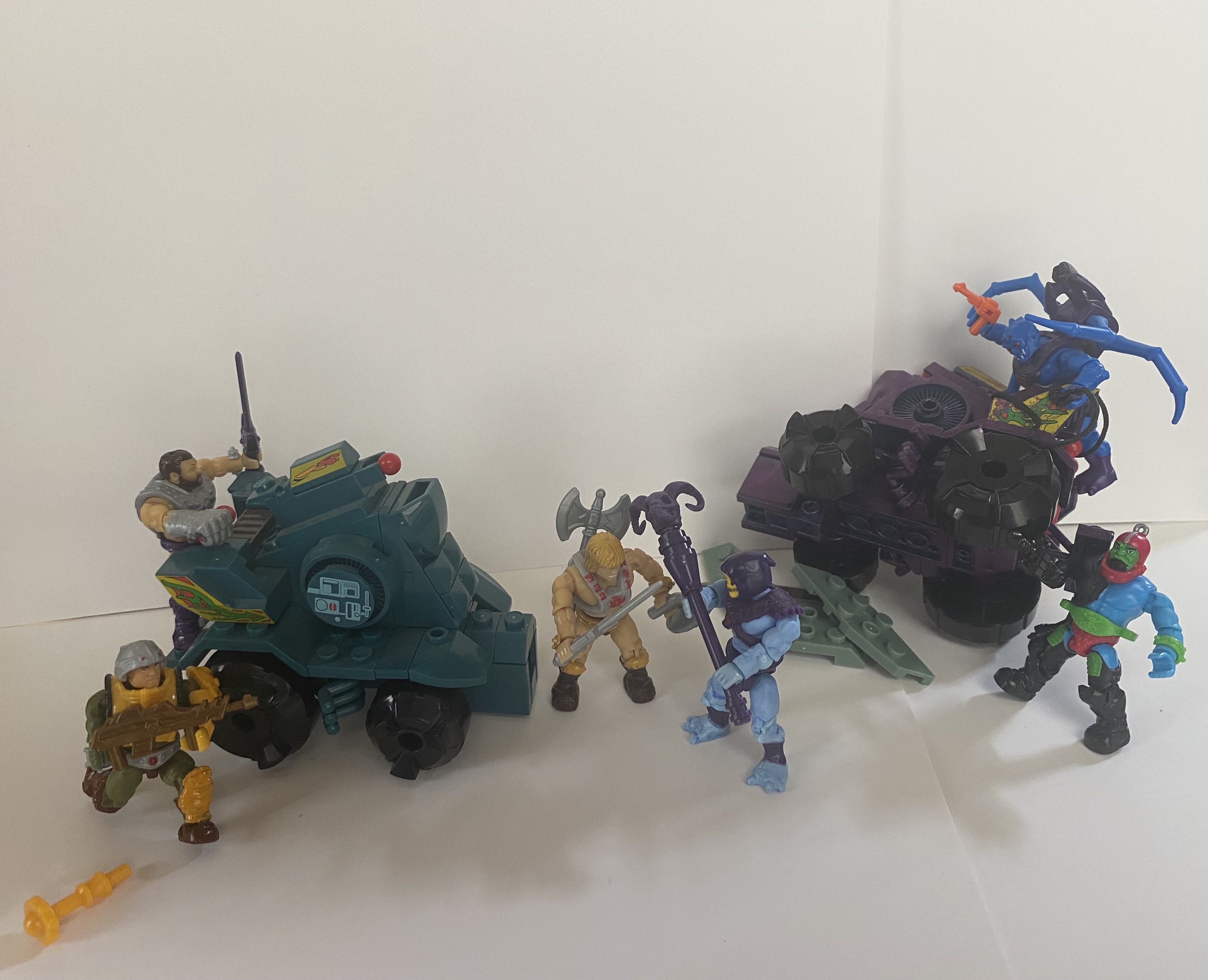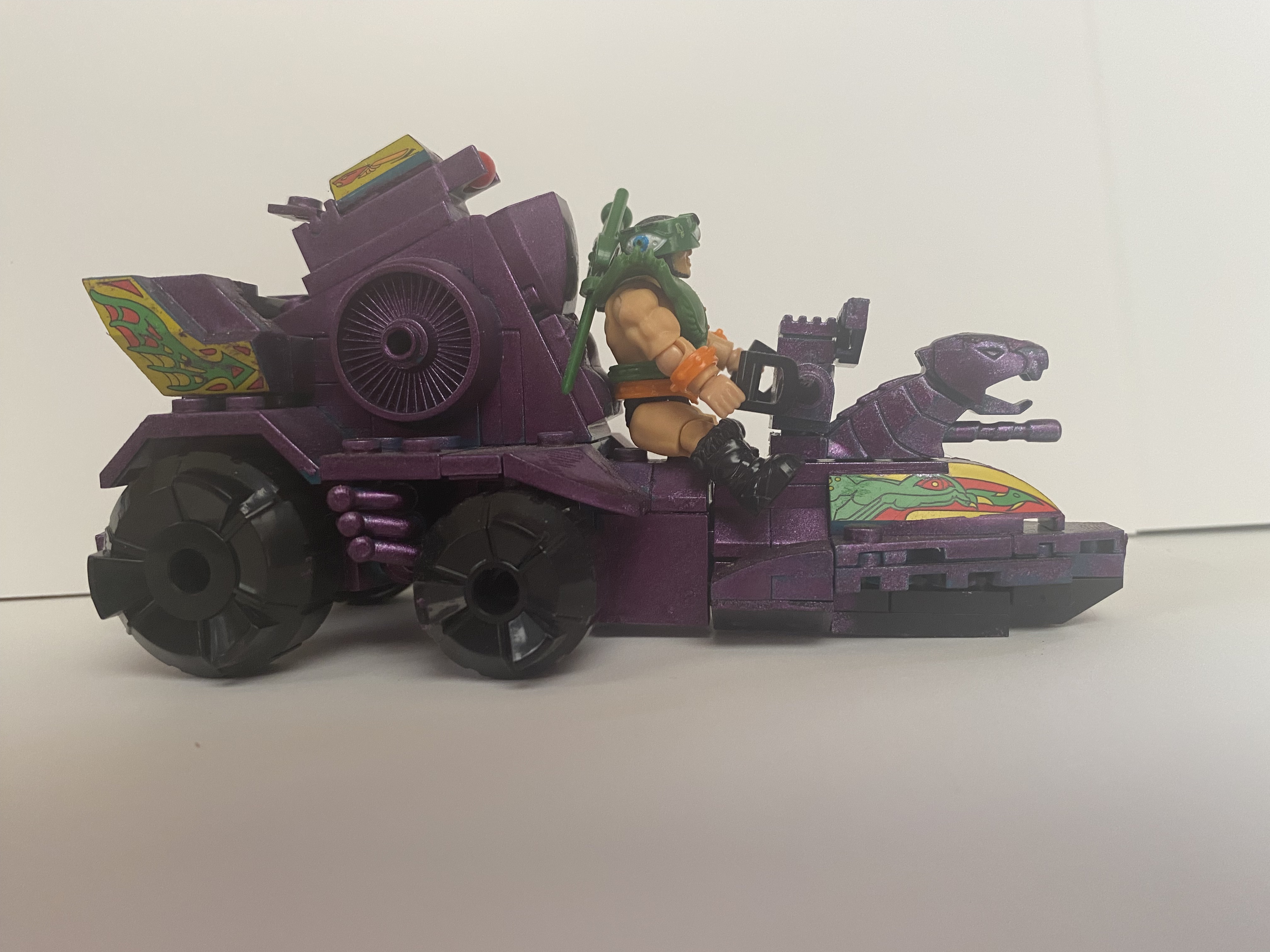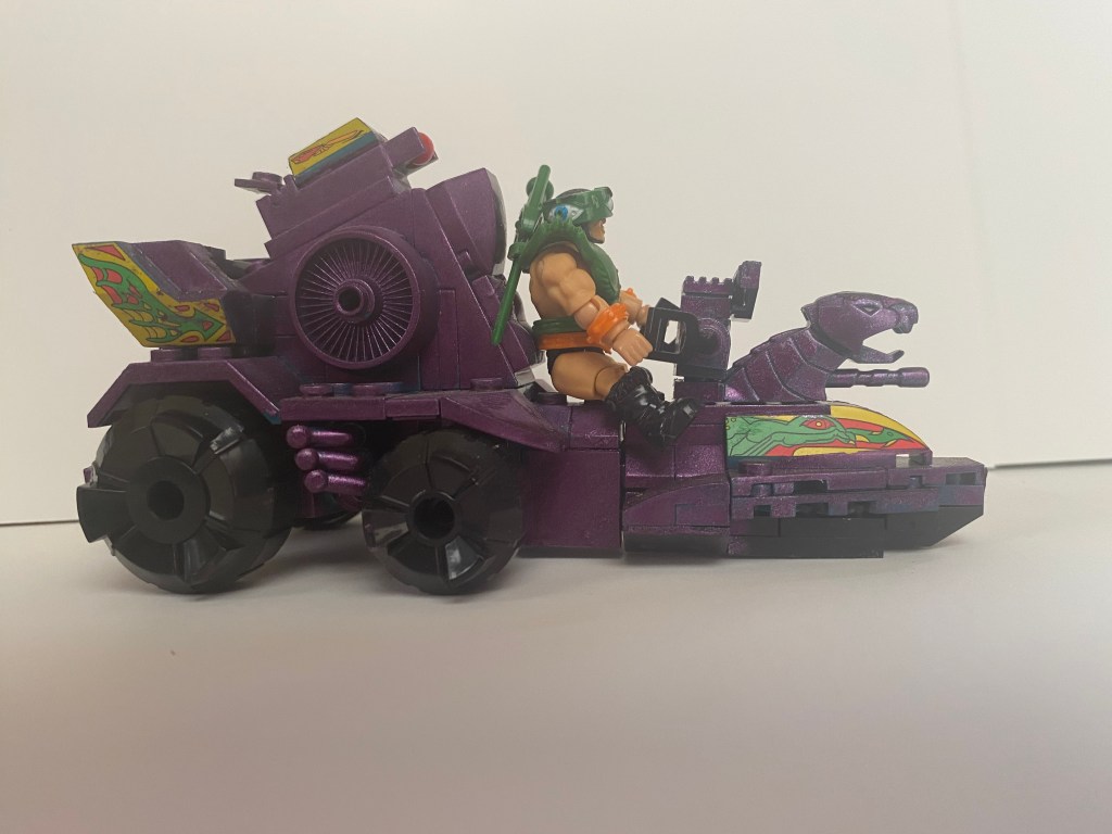 I don’t remember how long ago this was. At some point between taking this photo (August 20, 2020) and selling off my MOTUC toys, I picked up two Battle Ram Mega Construx sets. It became my intention to make one of them “evil” in purple. After all, the set comes with a griffon head and a serpent head. They encouraged us to use our options!