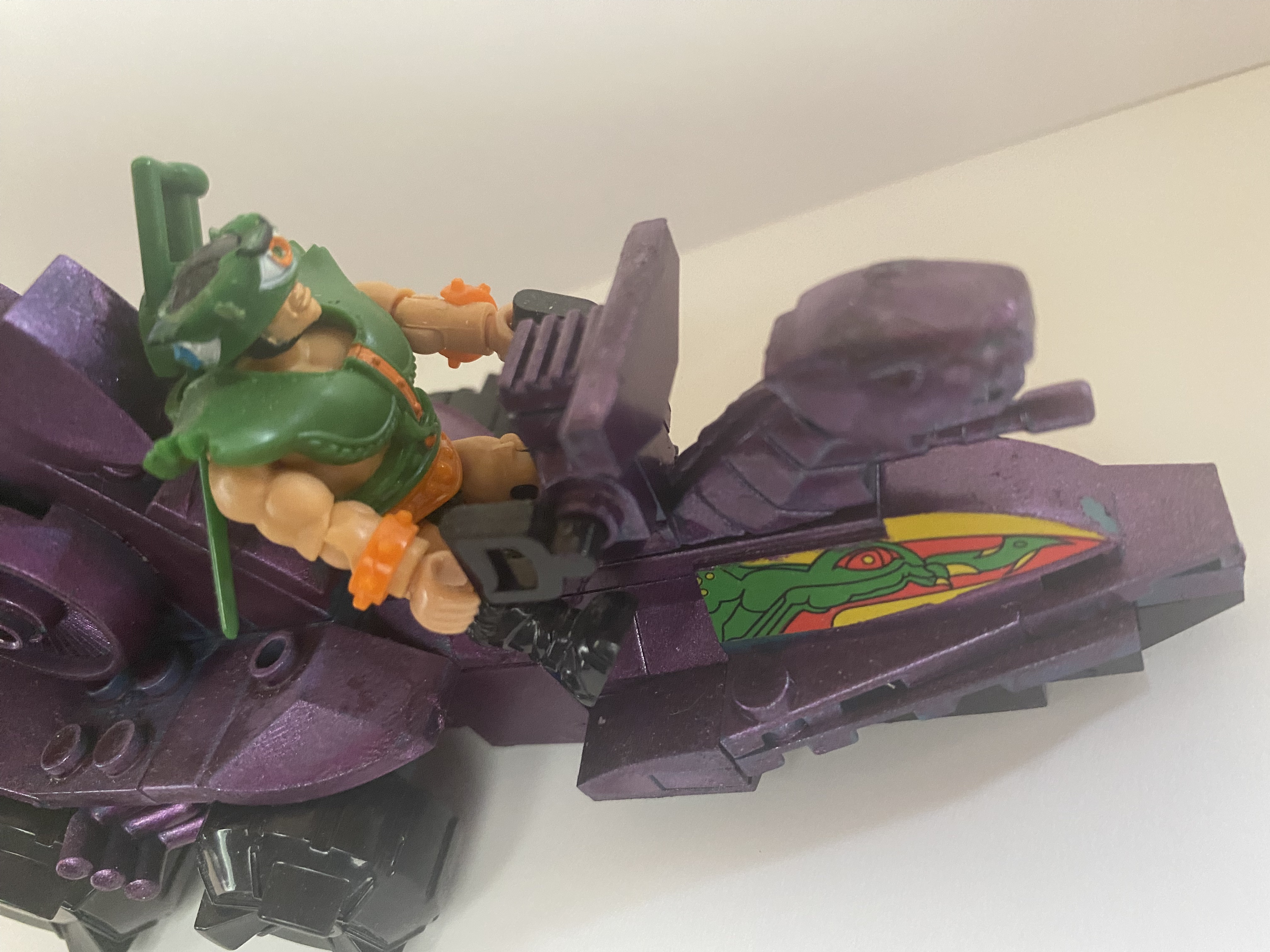You can compare the original with the purple one. I couldn’t do anything with the round control panel. I thought I might use some warhammer brushes on it or something. But in the end, I decided just to take it off. It looks more evil this way in my opinion. I mean, maybe the evil warriors are driving the old model. Or maybe they want to pollute, and that thing on the good one is some kind of environmental control. Or maybe (more likely) the Battle Ram is a relic of the old world, and Man-At-Arms has improved upon the design, while the bad guys just get the clunker model. I believe that part underneath to be some kind of turbine from an earlier non-motu set.