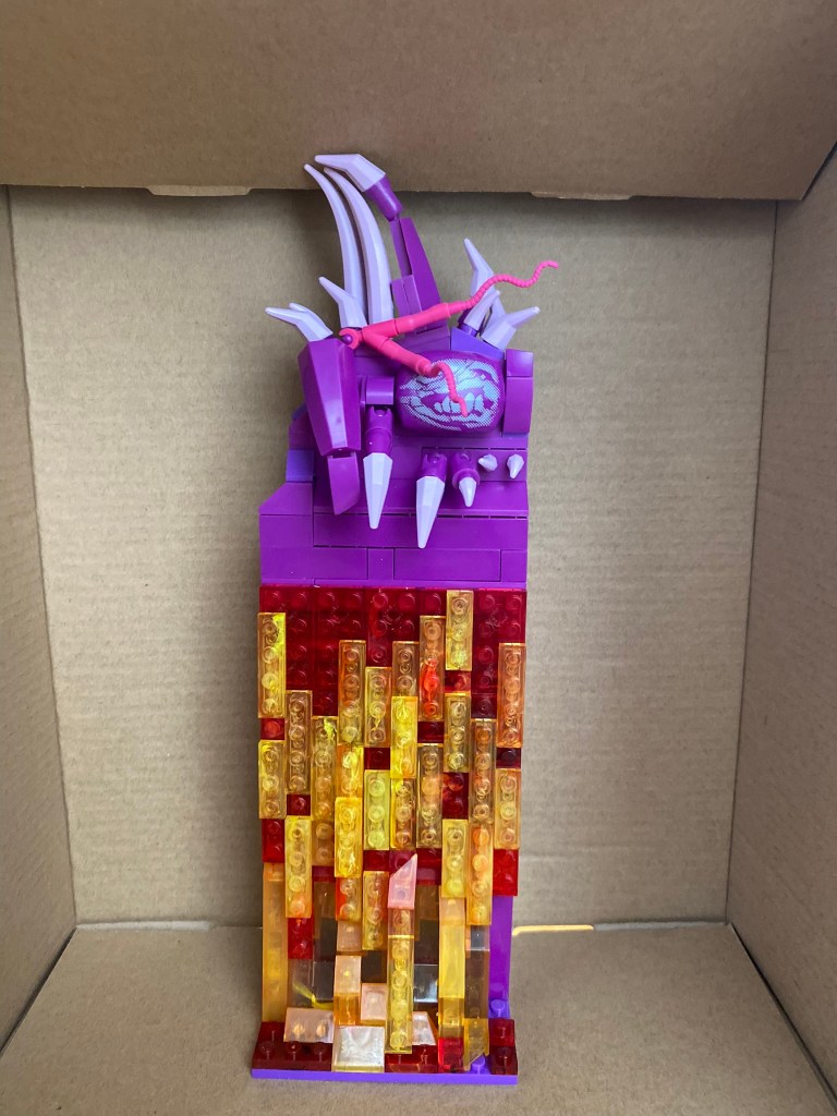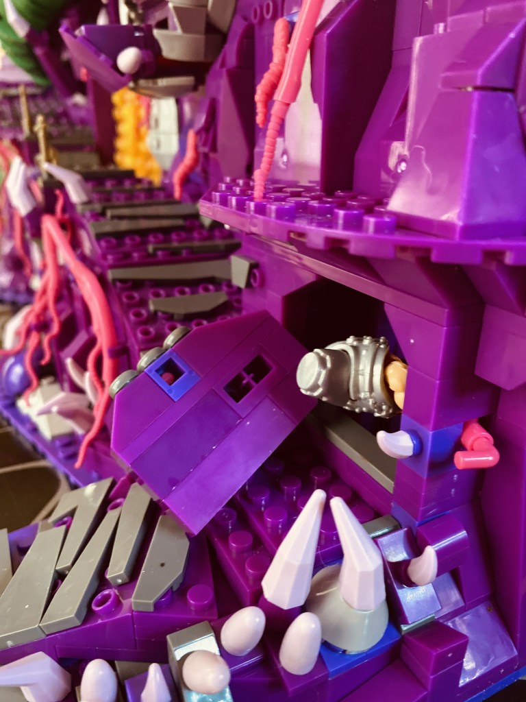 There are lots of pink squirel-ly things and a couple of “faces of evil,” as well as pink horns all over the place making this place into a corny, campy, obvious base for bad guys. One of the problems I had more than once in both sections of this build was getting the “faces of evil” to work. I wound up adding a round or square stud piece in several instances to make them fit. (You can’t tell I added a piece.)