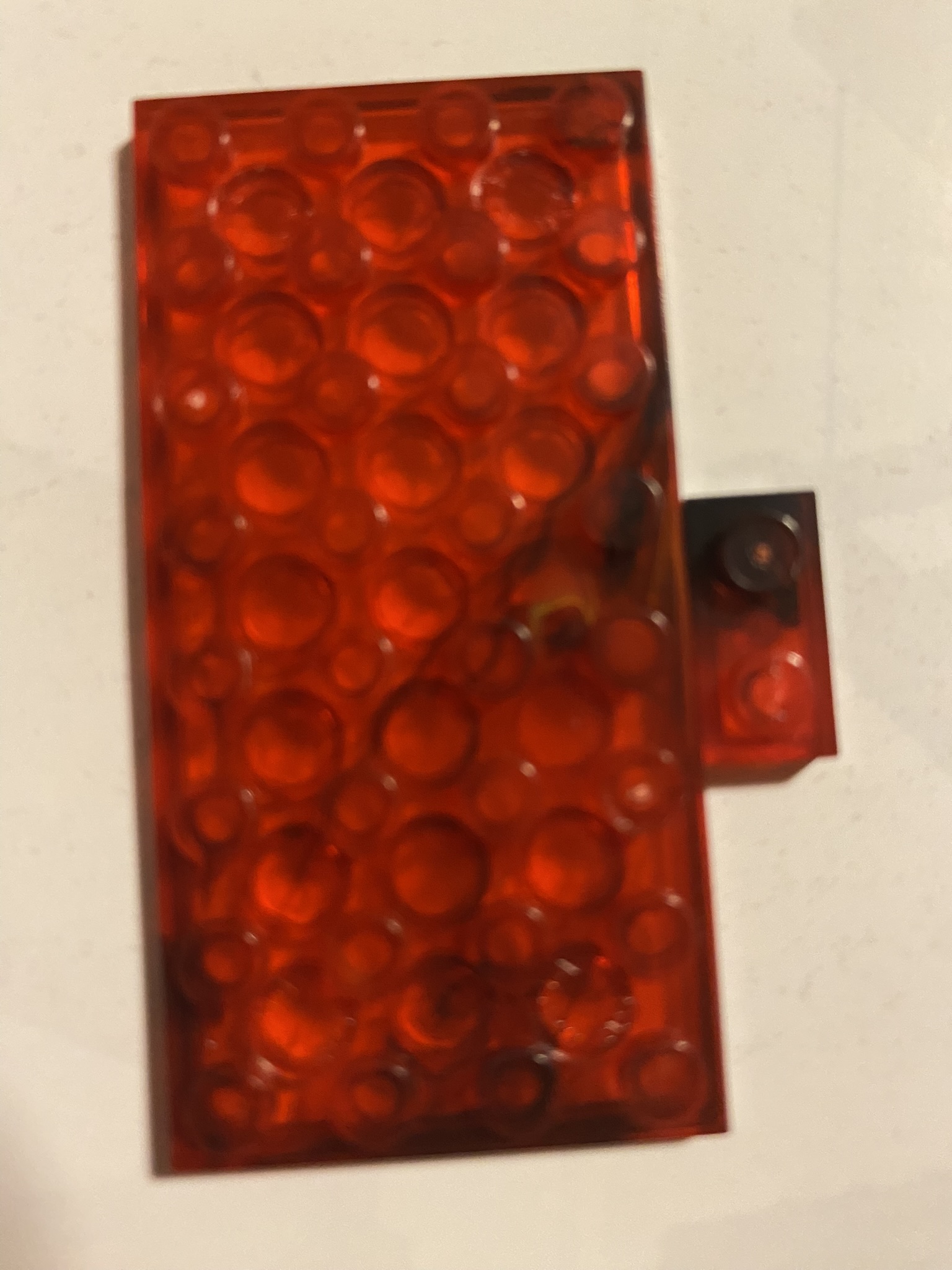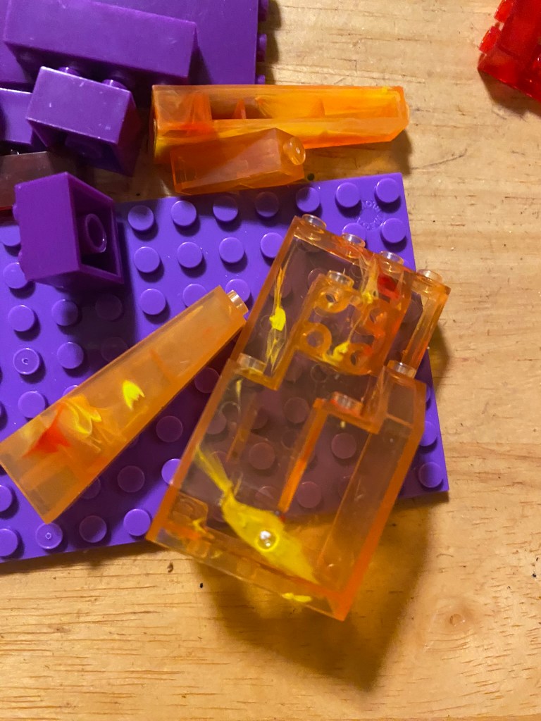 You can take a flashlight of some kind and shine it behind and it makes a really cool glowing effect! The way the pieces are layered is also very fun and satisfying. The mix of translucent yellow/orange, opaque red, plus those unsightly paint splotches are what makes this work. (Isn’t the bridge a cool feature. And it is designed to break down like this also!)