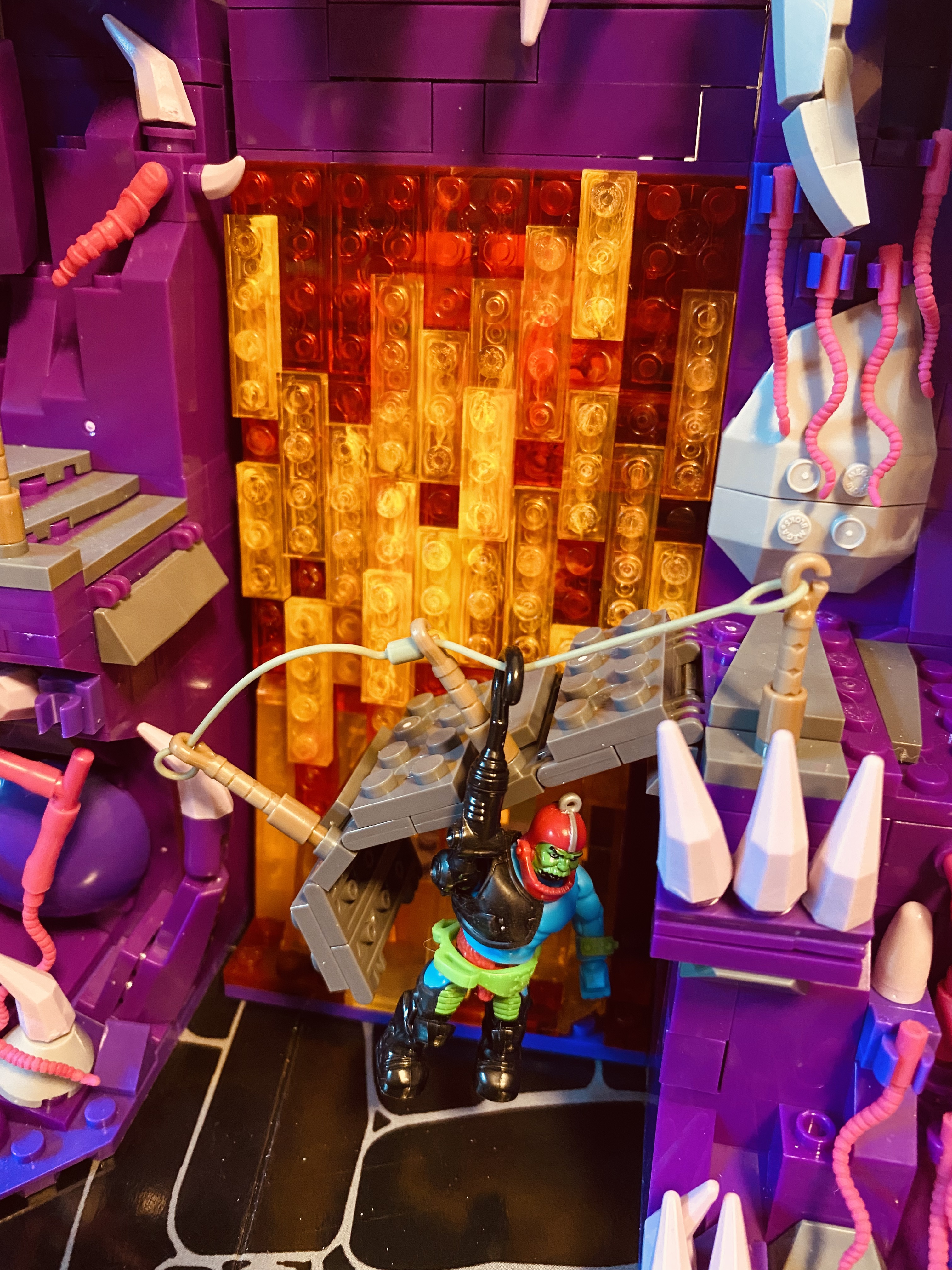 As you can see, there is a nice stairway going in front of the face that leads up to the bridge that crosses the lava slide. There is a ledge with shackles…actually a piece of the vintage design that I had forgotten about! In order to get a minifigure on it correctly, you pretty much have to take the chains off and attach to the arms, and then put them back on the wall. Beneath the ledge there is a false wall so that prisoners can bust out! It has a much better switch to cause it to open than the ones that came with Grayskull.