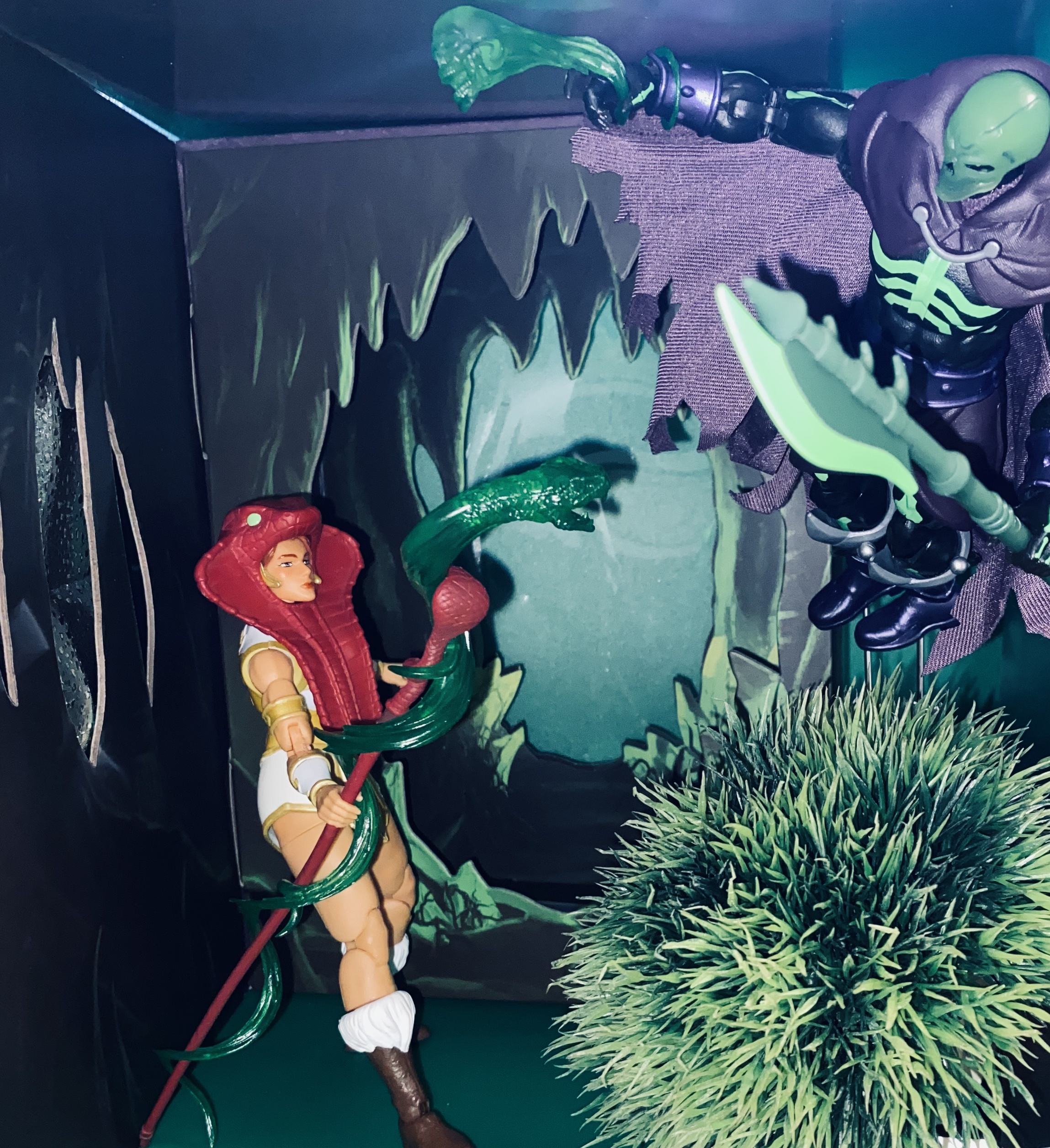 Pictured: MASTERVERSE Scare Glow con-exclusive with Subternia backdrop and an added plant detail, MASTERVERSE Revelation Teela, who is armed with the MOTUC Great Unrest weapons pack snake armor and Staff of Ka. Both characters are using Mythic Legions magic effects, and Scare Glow is on the Cosmic Legions figure stand.