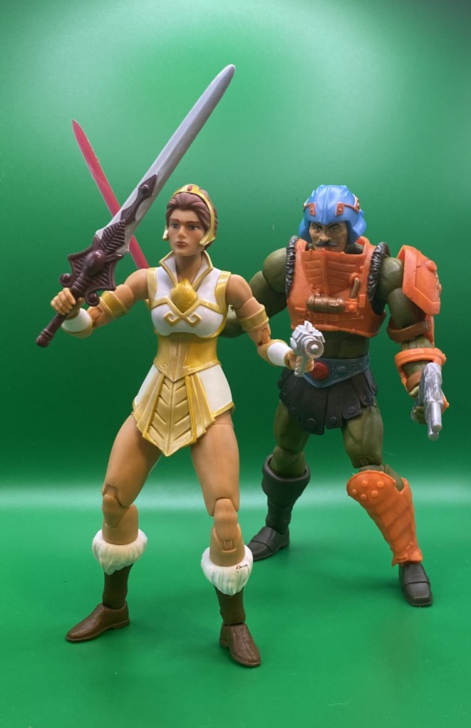 Pictured: MASTERVERSE Revelation Teela and MASTERVERSE New Eternia Man-At-Arms. Teela is wielding The MOTUC Great Unrest Weapons pack sword and pistol, while Man-At-Arms is wielding MOTUC Sir Lazer-Lot’s sword and MASTERVERSE New Eternia Two-Bad’s pistol.