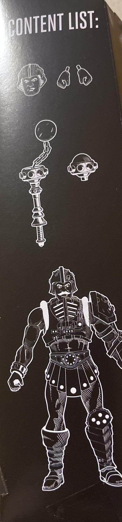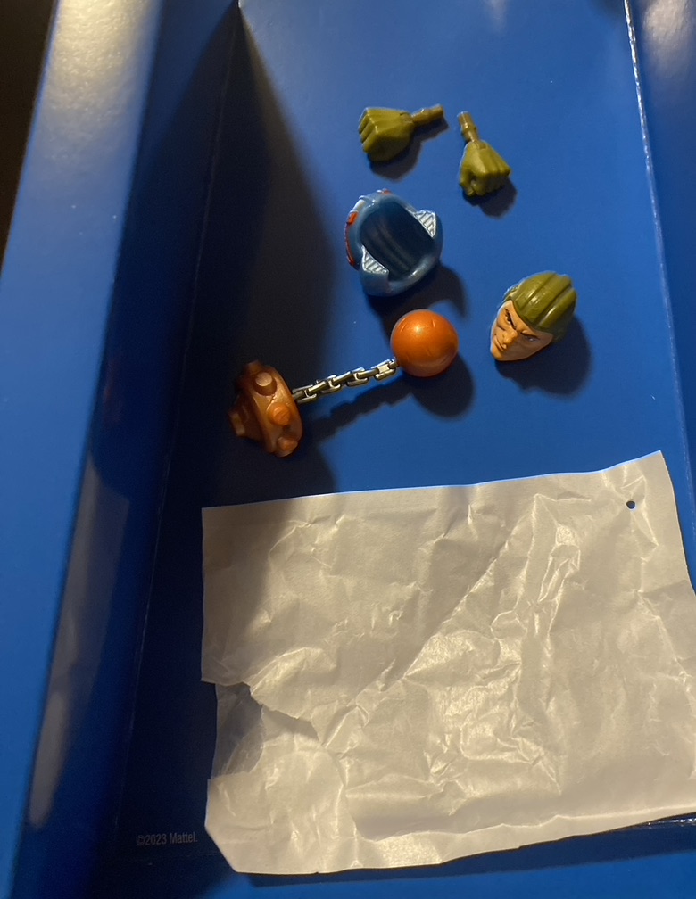 Here’s what was in the box. Two fists. A non-mustached head. An alternate helmet. And a ball-and chain alternate mace head.