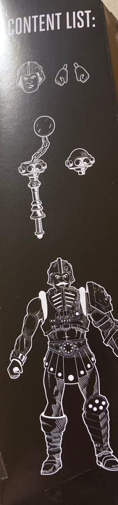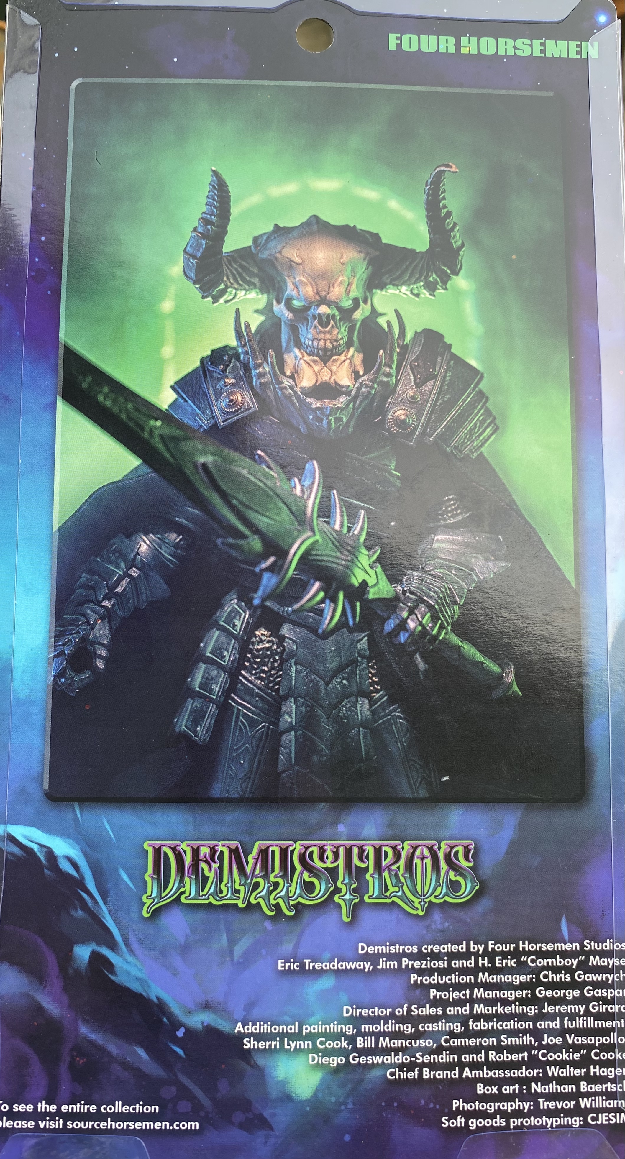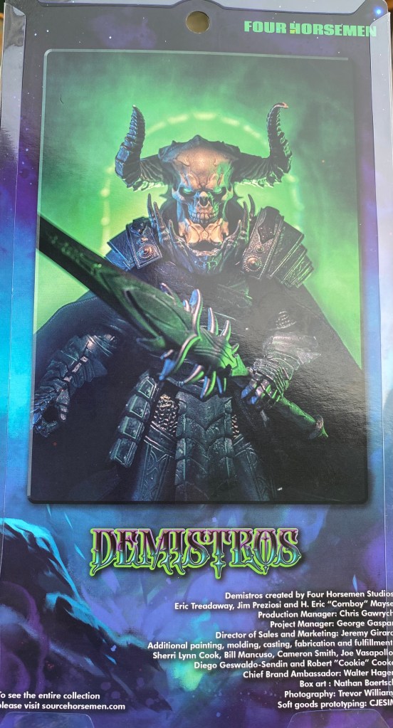 Demistros came in a plain box in the mail…it was small enough to fit in my grandma’s mailbox! (long story). But it was the perfect size. I don’t usually care, but it was nice to have a little less trash. Demistros’ package was no bigger or different than other Mythic Legions figures….But wait. Here’s a point. Demistros isn’t a Mythic Legions figure! They actually made him to be one of the generic baddies you might have encountered in 1980’s cartoons. They say so on the side back!