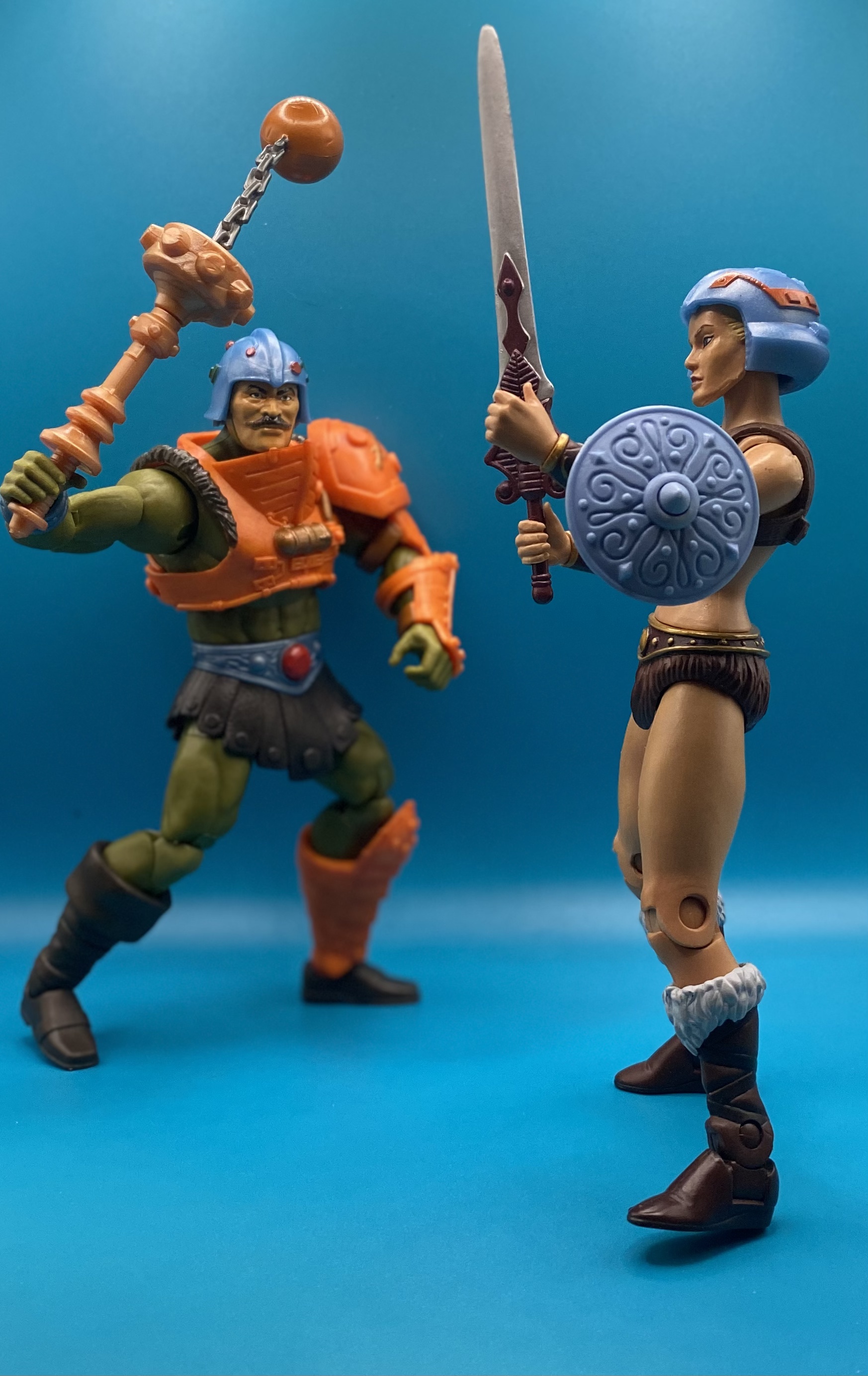 Pictured: MASTERVERSE New Eternia Man-At-Arms and MOTUC Battleground Teela with customized head. She is wearing the alternate helmet that came with Man-At-Arms, and is armed with weapons from The Great Unrest weapons pack.