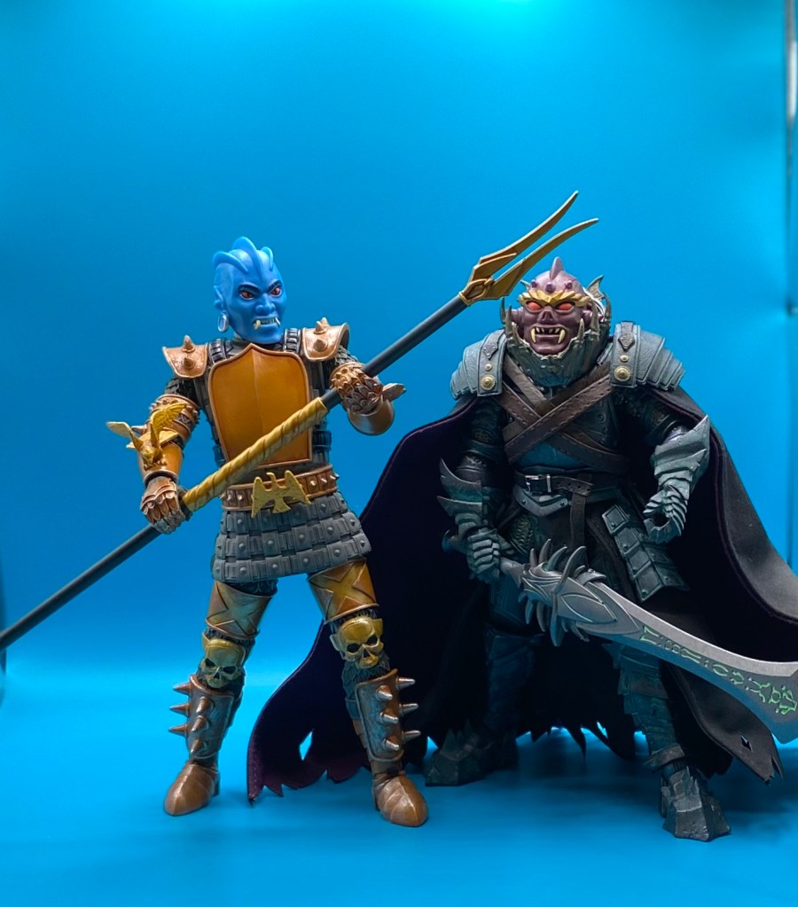 Pictured: MASTERVERSE Revelation Teela vs. Mer-Man. Mer-Man is armed with not only his scimitar, but also MOTUC Sir Lazer-Lot’s shield.