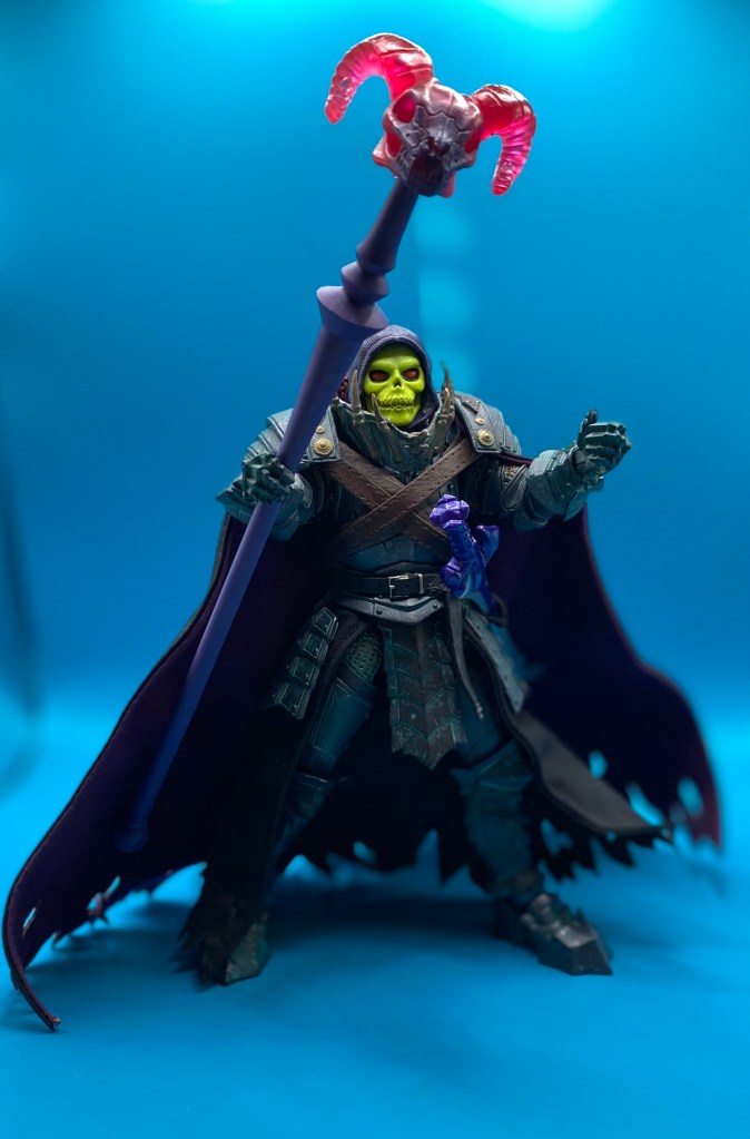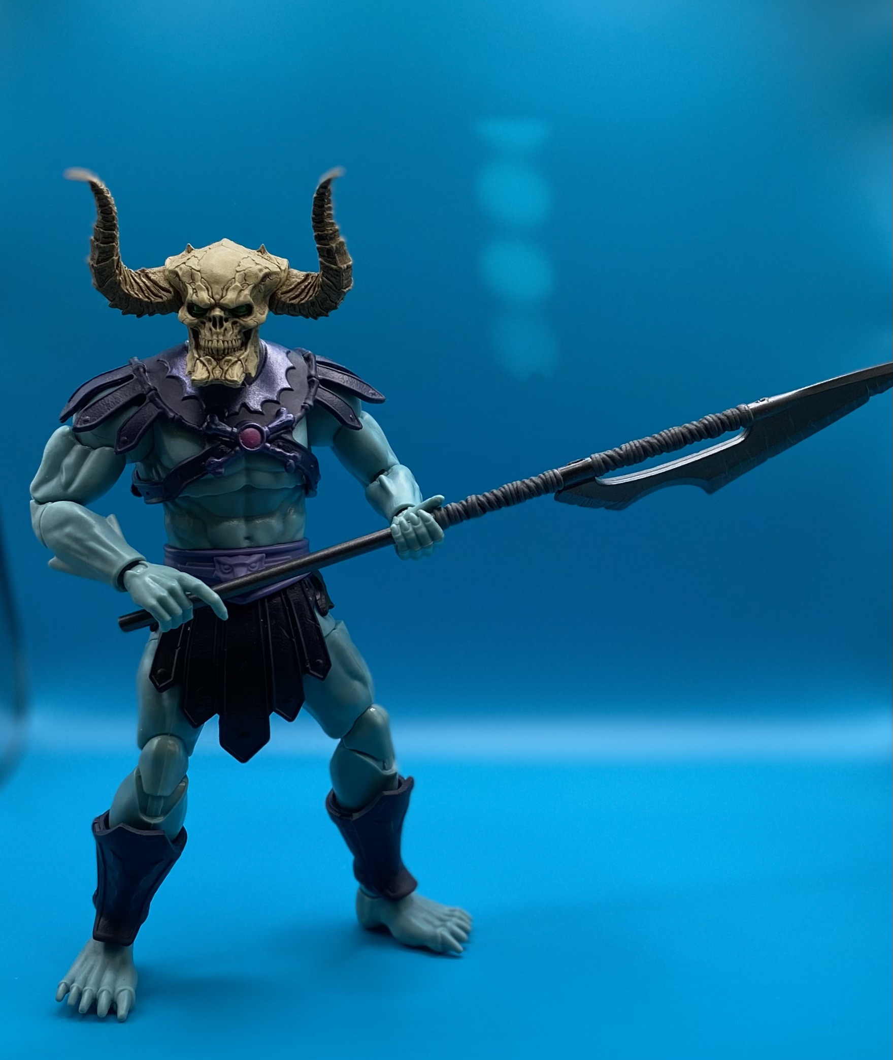 Pictured: Demistros body with MASTERVERSE New Eternia “Viking” Skeletor alternate head, MOTUC Havoc Staff from The Faceless One, and purple Power Sword from MASTERVERSE King Grayskull.Pictured: MASTERVERSE New Eternia “Viking” Skeletor body with Demistros head and spear.