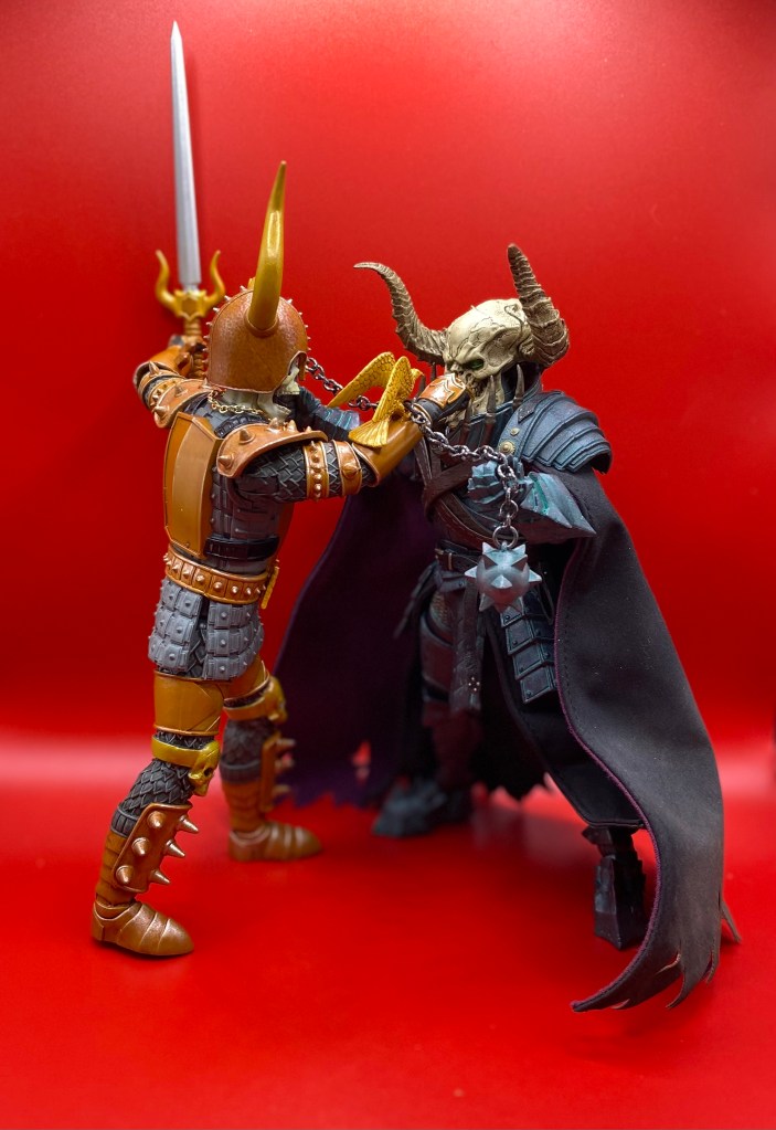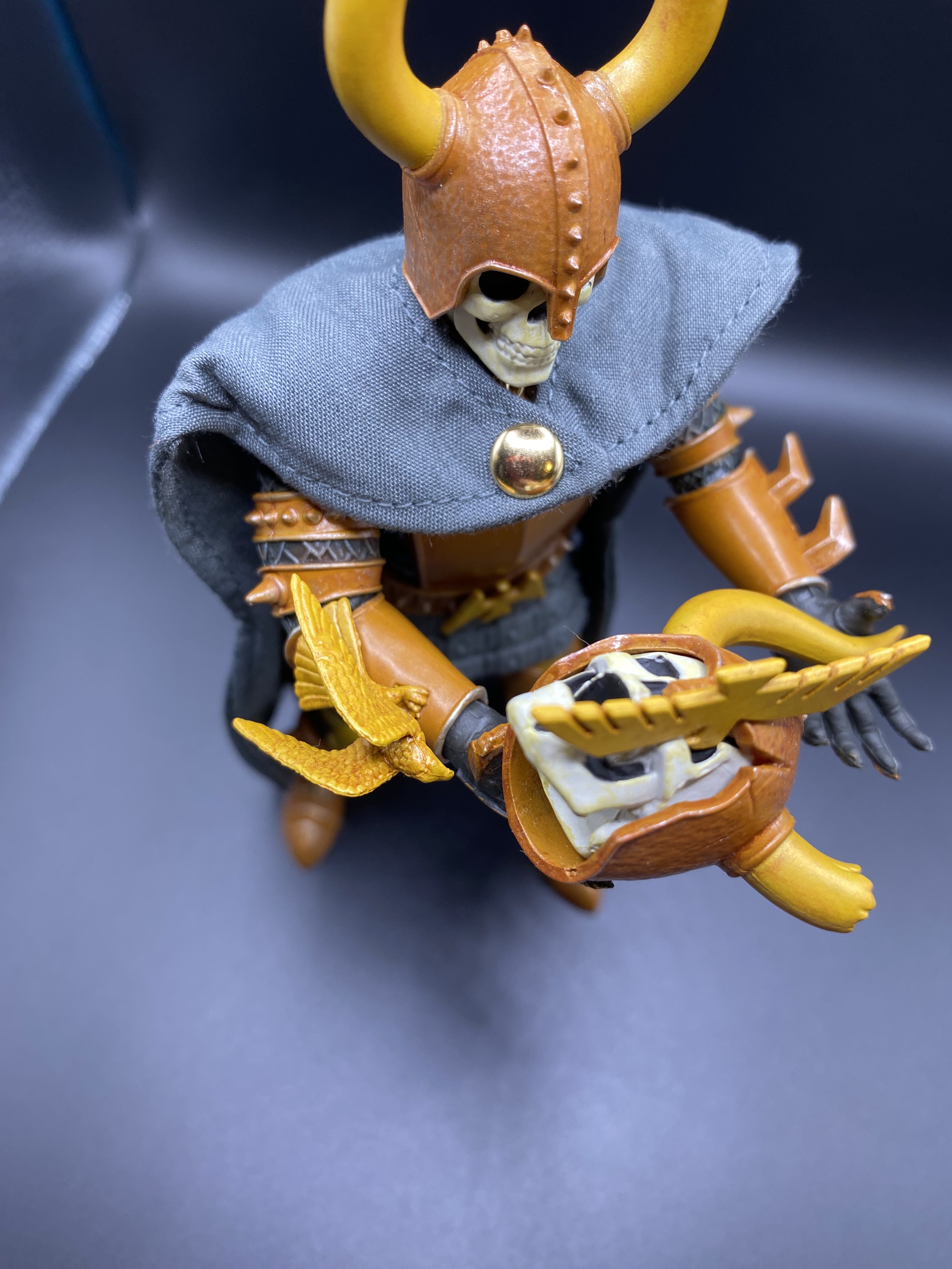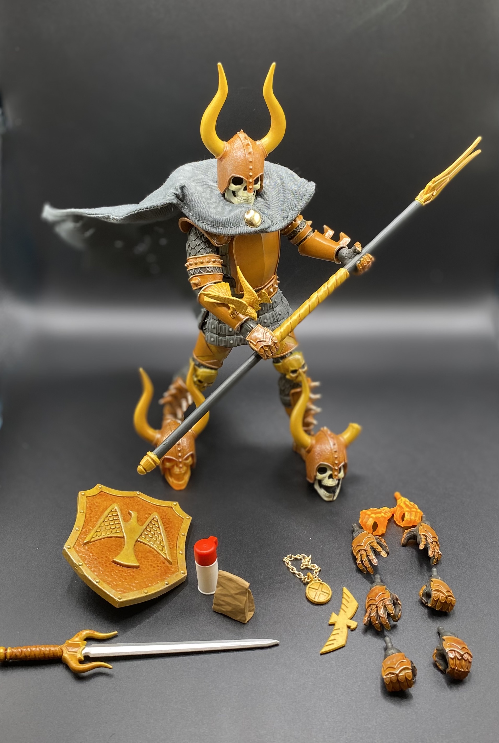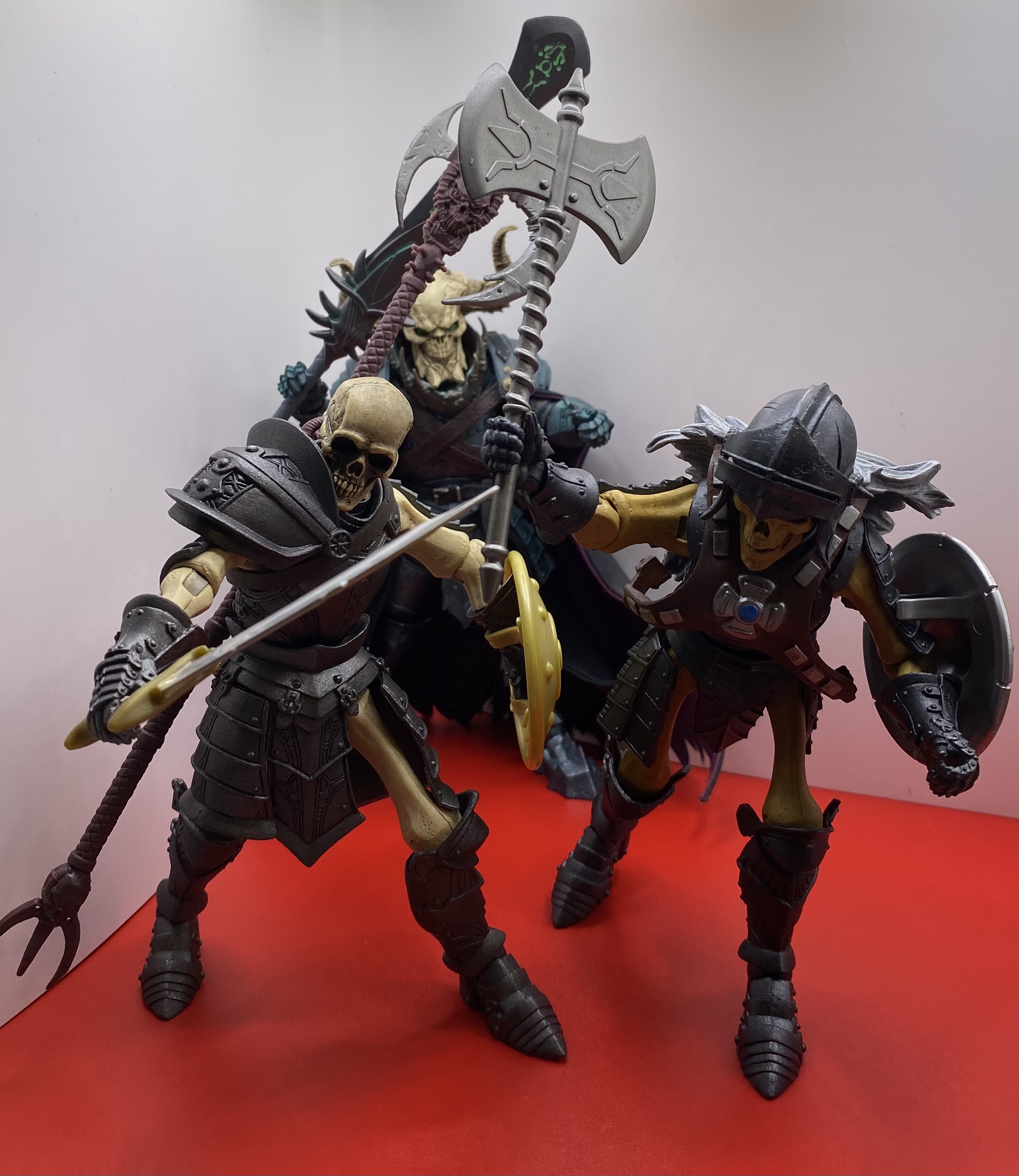 Pictured: Mythic Legions skeleton “legion builders” armed with MASTERVERSE New Eternia “Viking Skeletor” scimitar and MASTERVERSE Revelation Teela’s shield, McFarlane Toys Raven Spawn scythe, Masters of the Universe Classics Vykron barbarian axe and armor, Masters of the Universe Classics Vikor shield, and Demistros commanding them to battle.