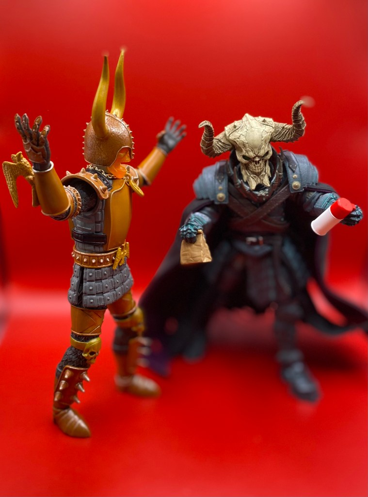So here are some things. That head sculpt…when I ordered it, I didn’t realize how much of a BUTT CHIN it would have. I mean…severe BUTT CHIN. I mean, giant spikes coming from the chin! It is a very nice sculpt, and that is just a wacky detail. Green evil eyes. Kind of a repugnant smile. I think it was the horns that sold me. I am very partial to horned helmets. I did remove the horns with some force, and I am uncertain if they were meant to be removed, unlike most Mythic Legions parts. They snapped right back in, but caution, everyone! After I ordered this, I saw what must be the exact sculpt but red at the Toy Federation store in Greer, SC. With red, it looks like Satan. no other way to say it! It is amazing how much the paint changes the character.