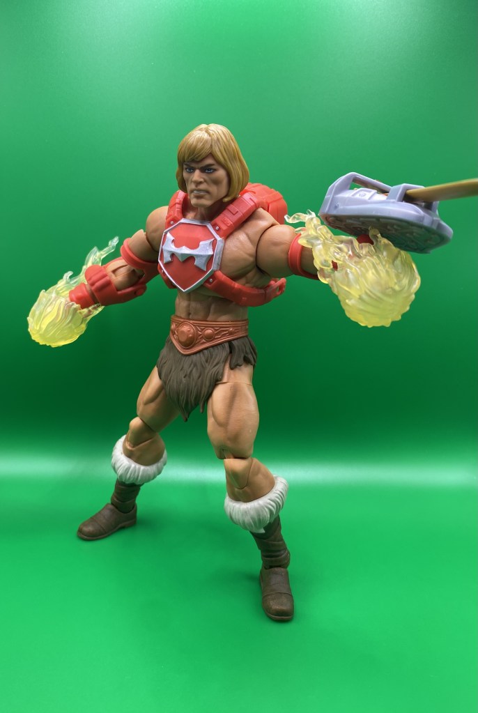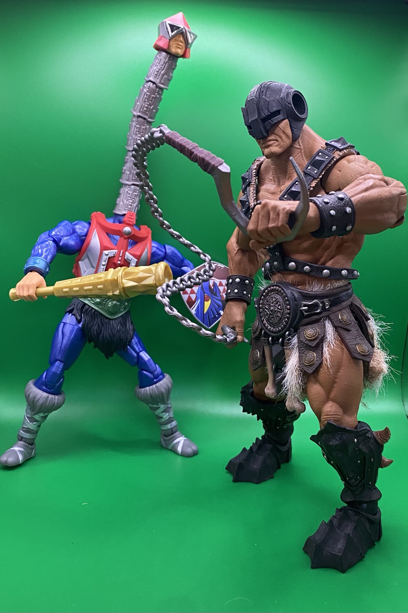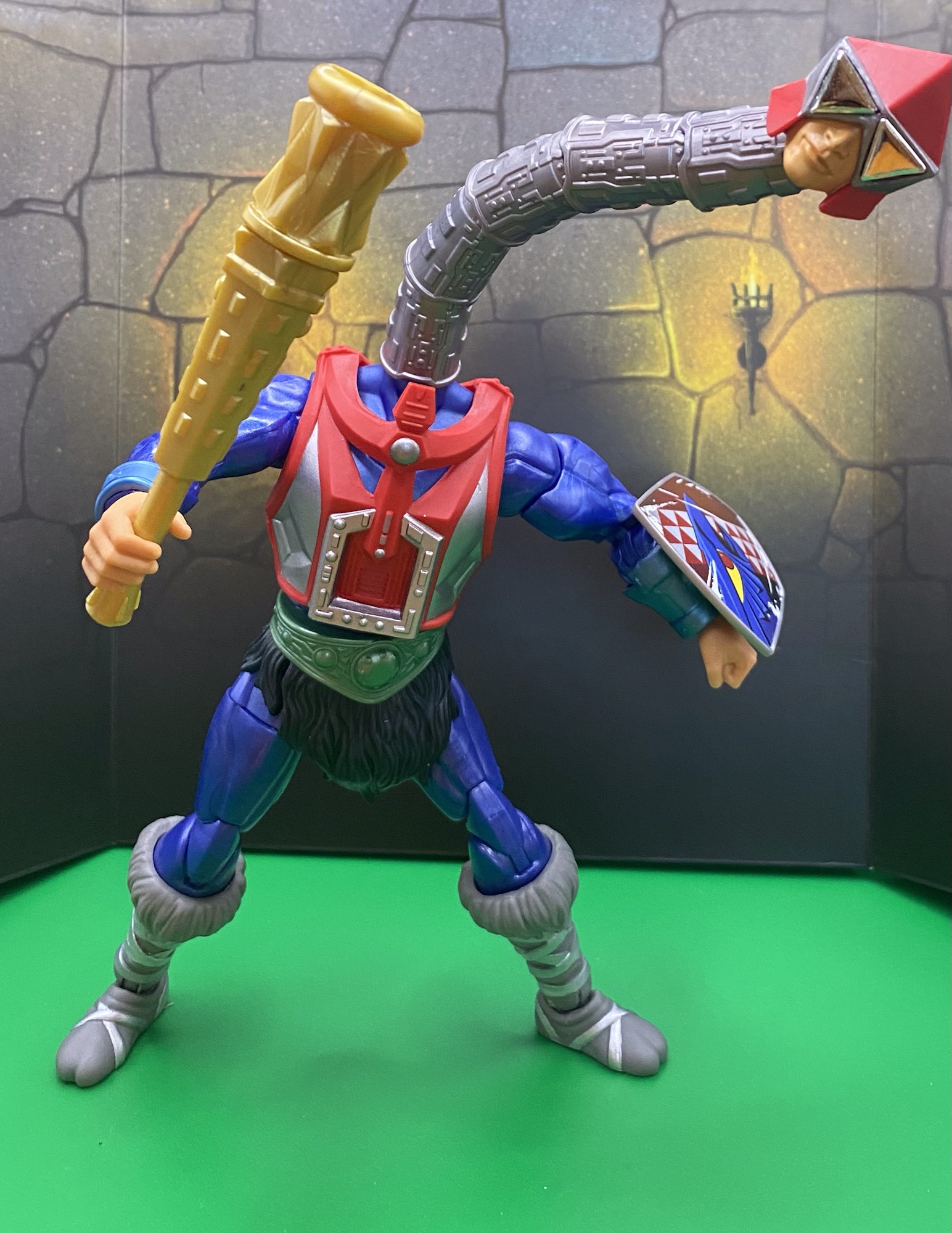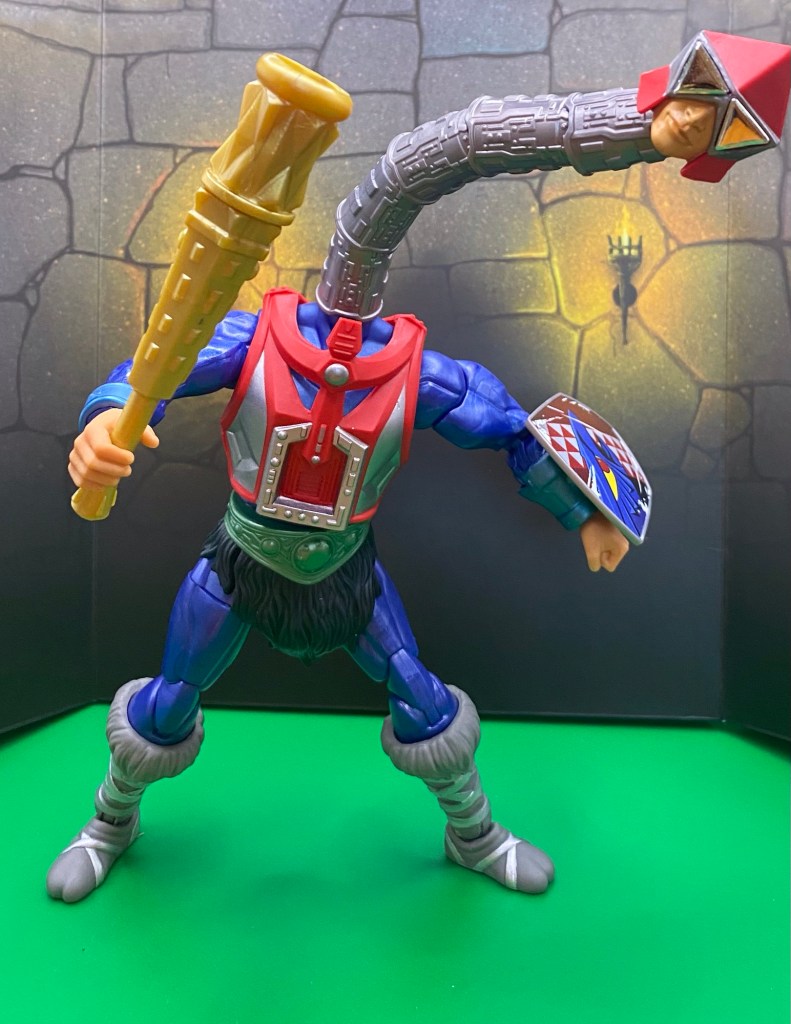 He has good articulation except for the rubber coat. This restricts him from sitting on a throne properly. Notice I put the MOTUC Faceless One’s Havoc Staff in his hand. We could have gotten a Havoc staff with a different colorway. No accessories really gripes me with action figures.