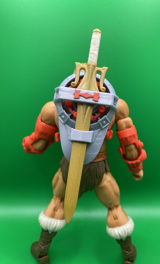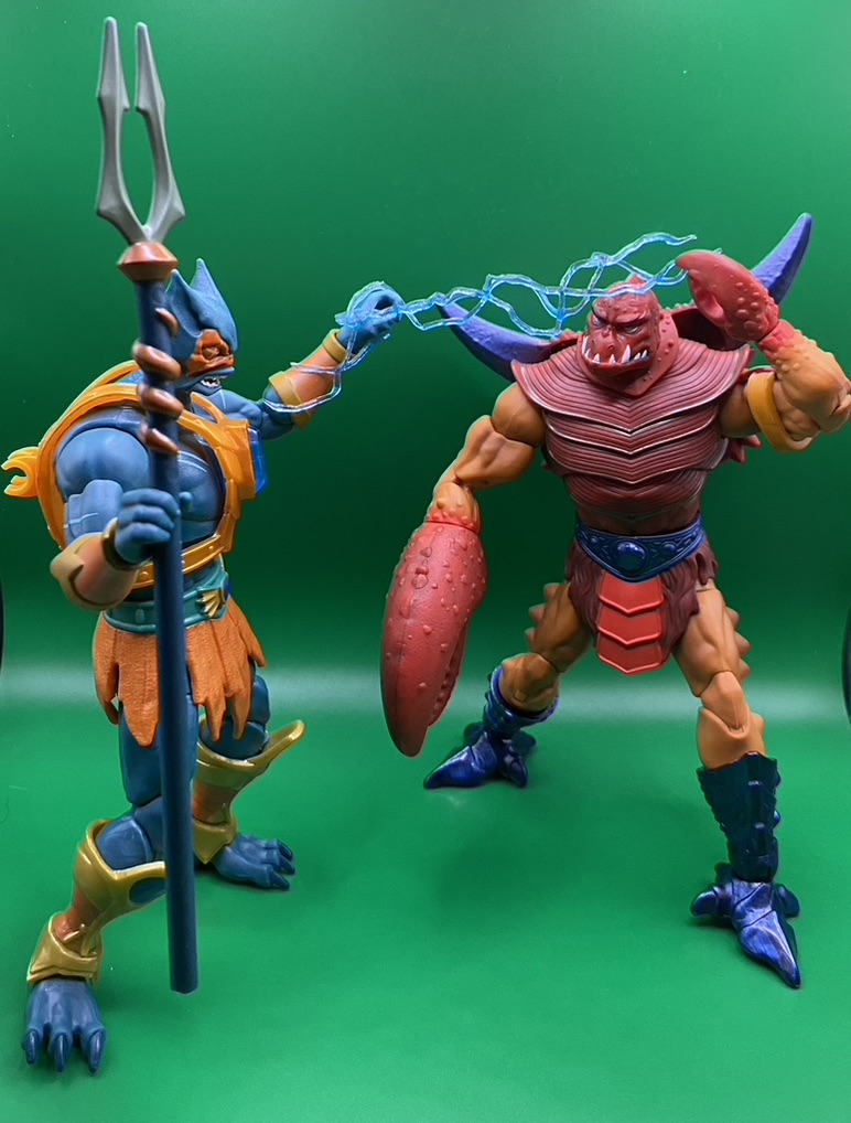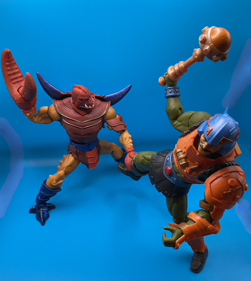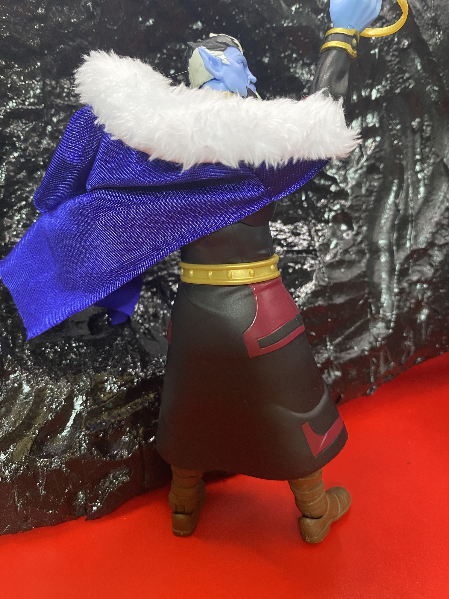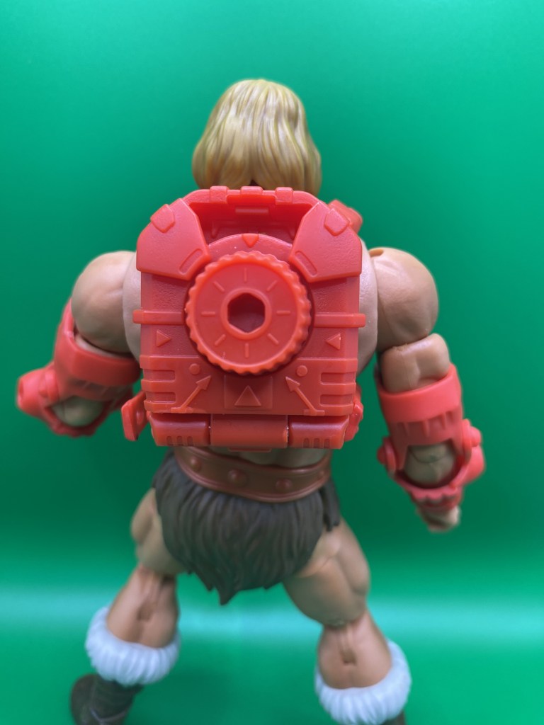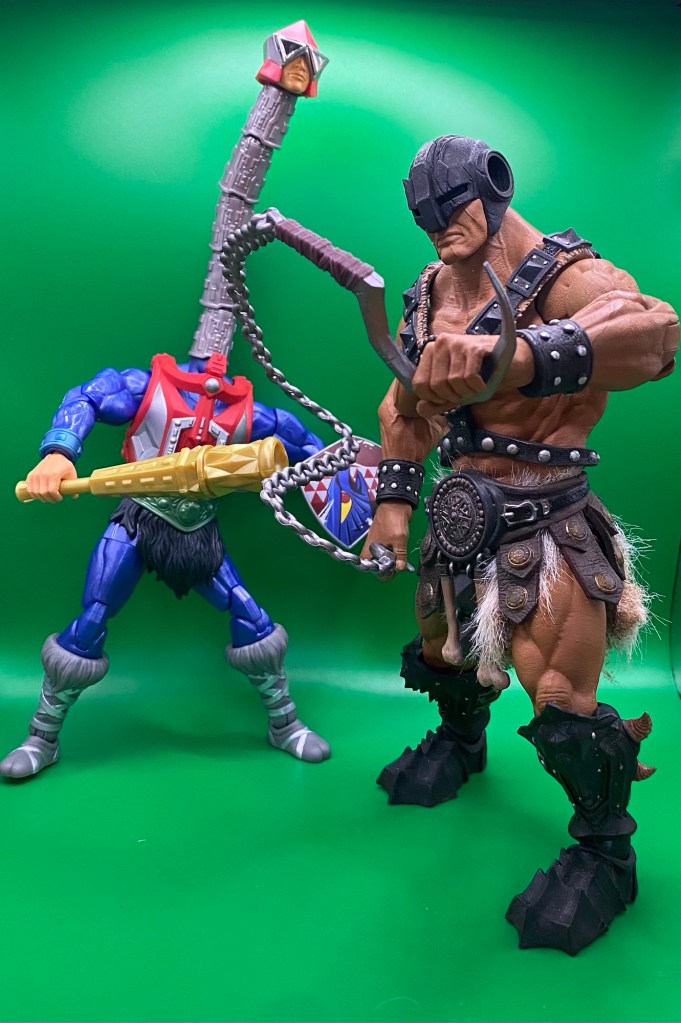He has good articulation except for the rubber coat. This restricts him from sitting on a throne properly. Notice I put the MOTUC Faceless One’s Havoc Staff in his hand. We could have gotten a Havoc staff with a different colorway. No accessories really gripes me with action figures.