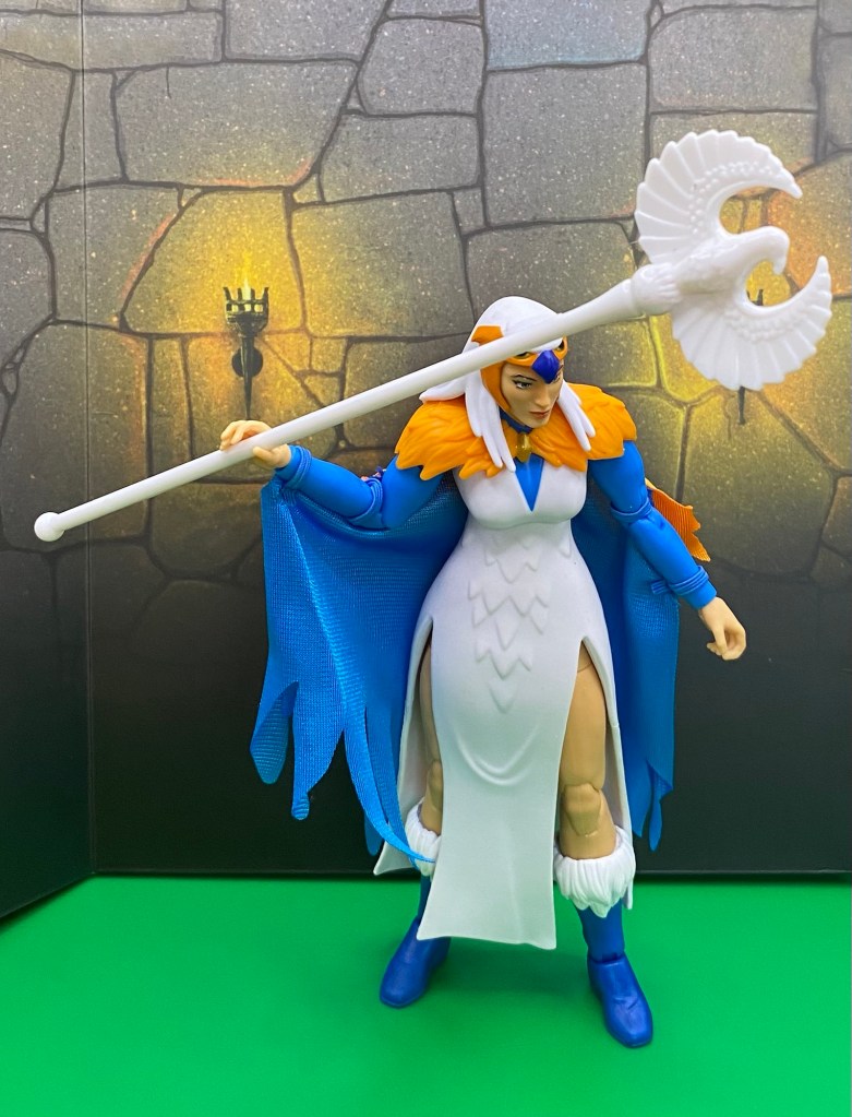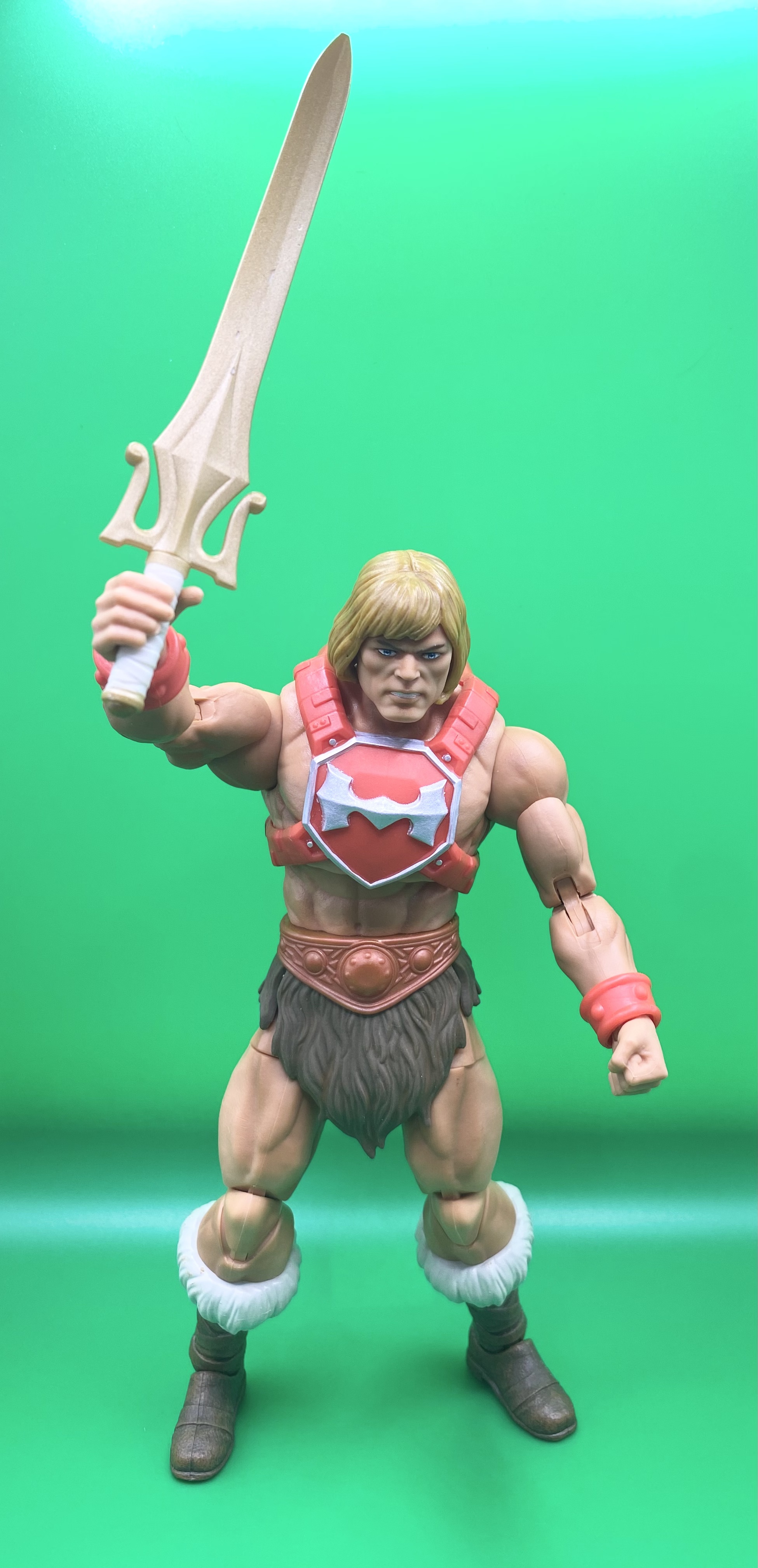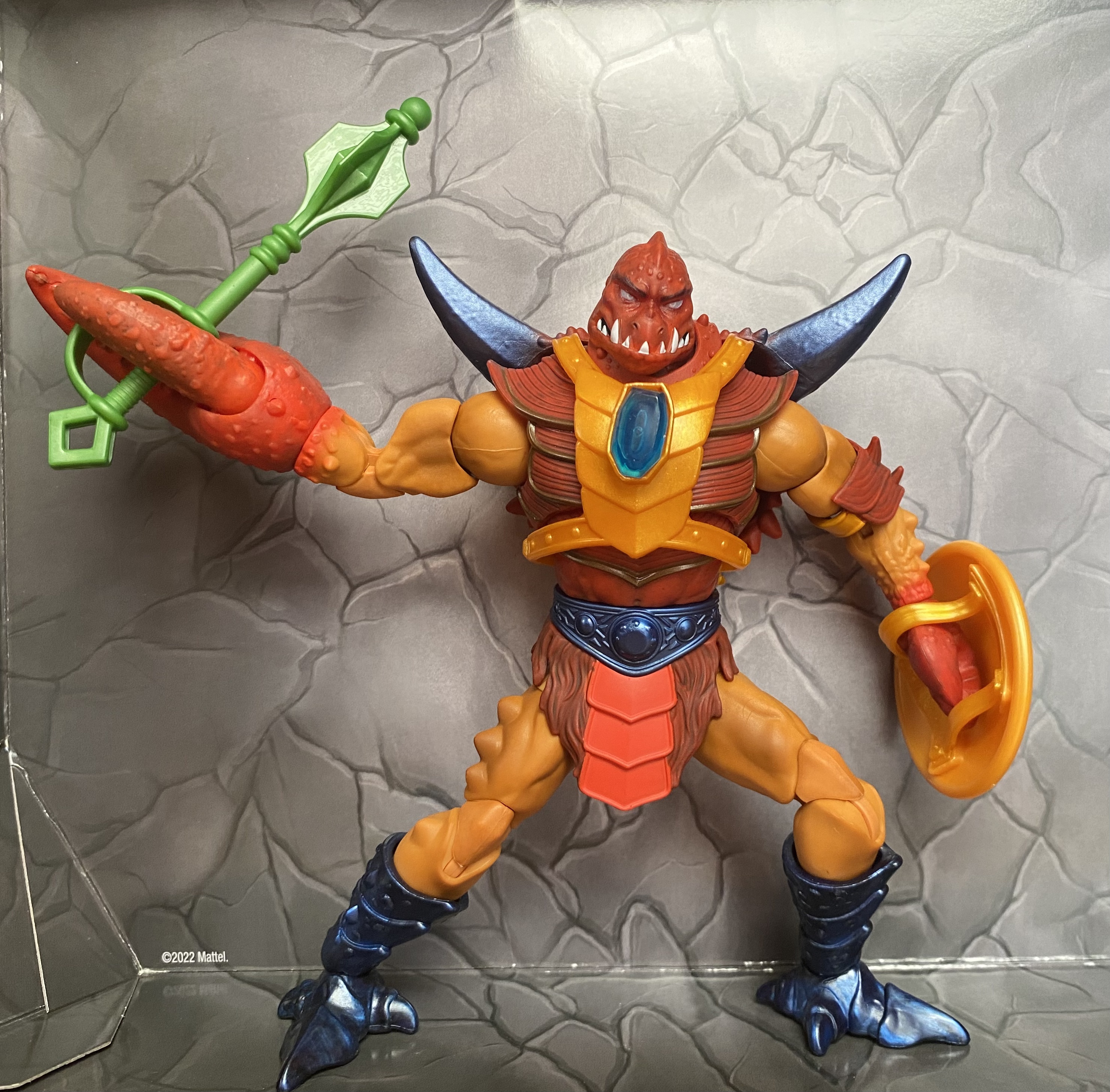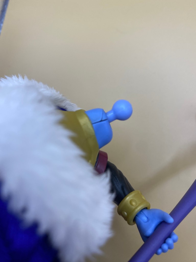 He has good articulation except for the rubber coat. This restricts him from sitting on a throne properly. Notice I put the MOTUC Faceless One’s Havoc Staff in his hand. We could have gotten a Havoc staff with a different colorway. No accessories really gripes me with action figures.