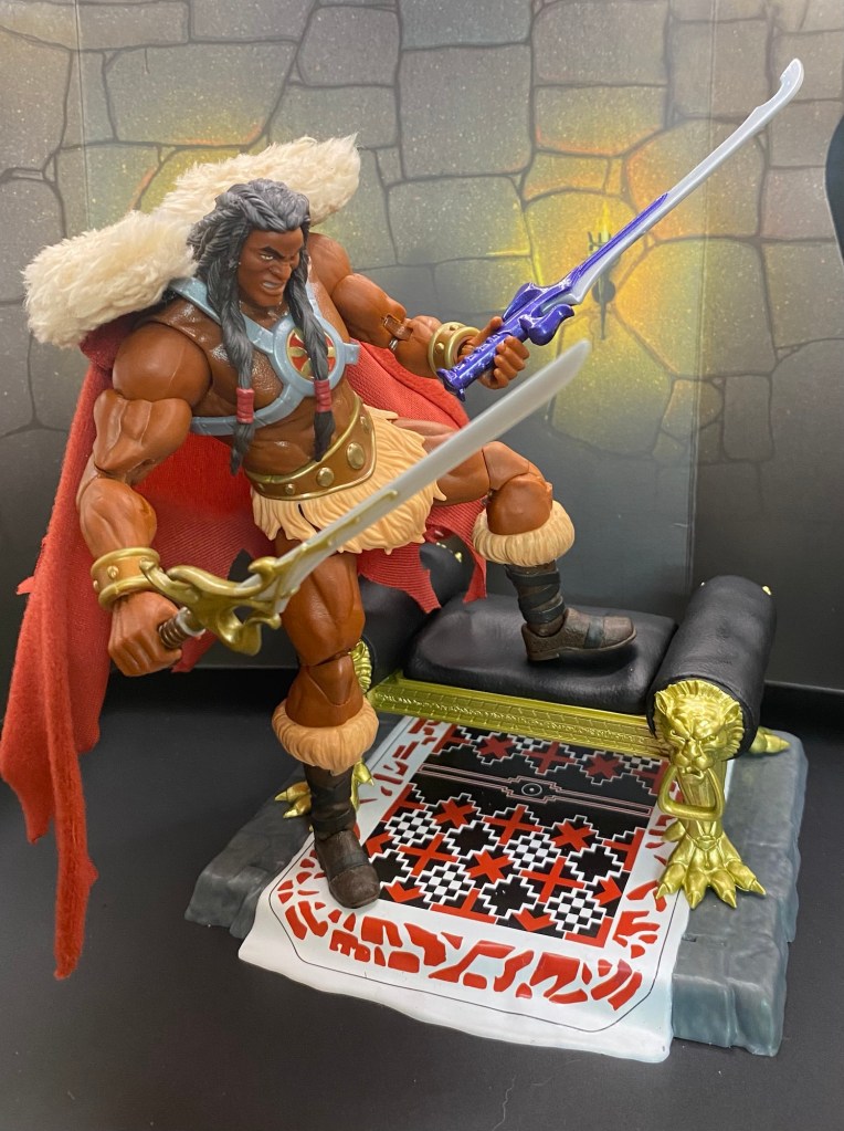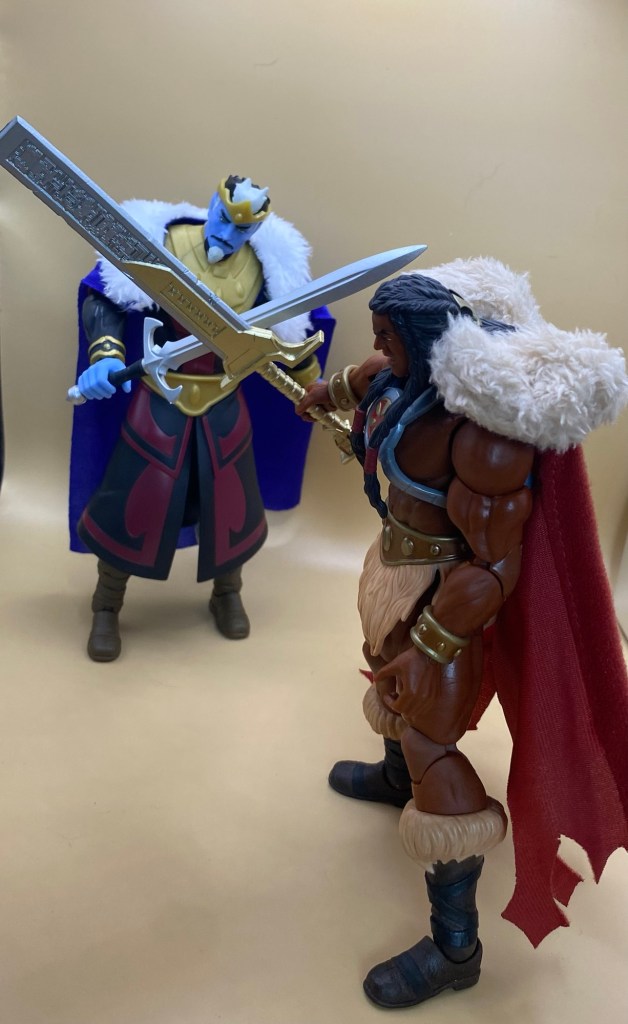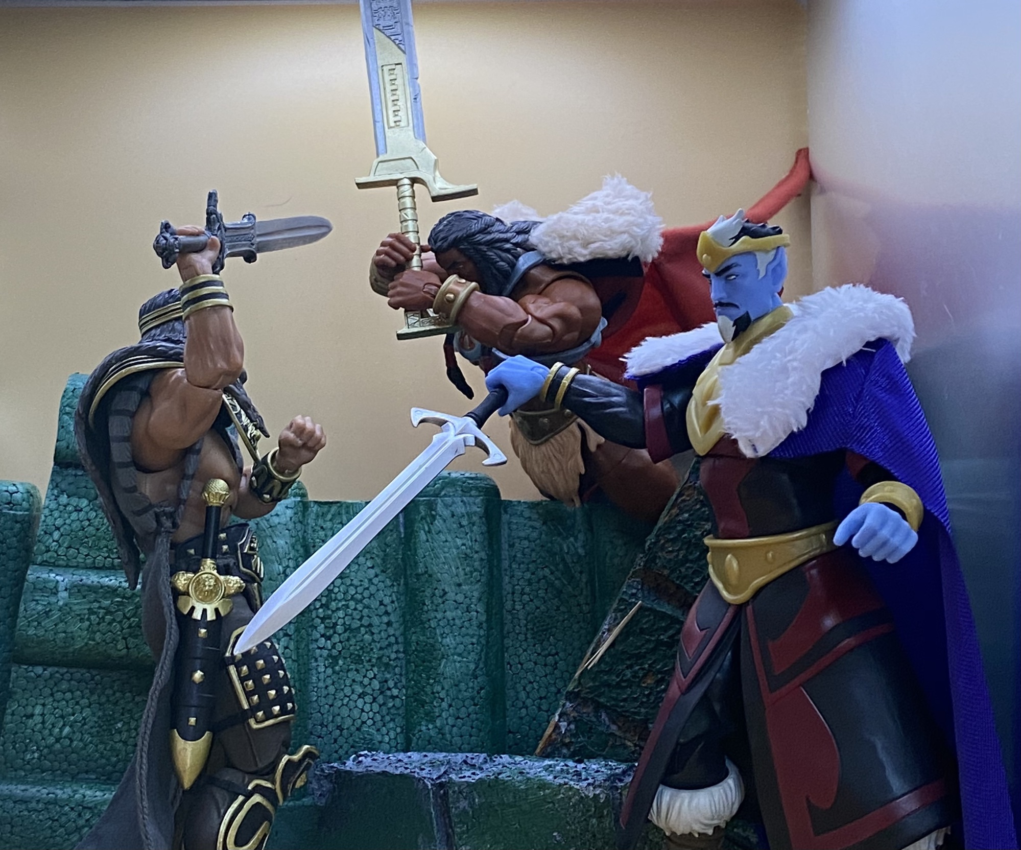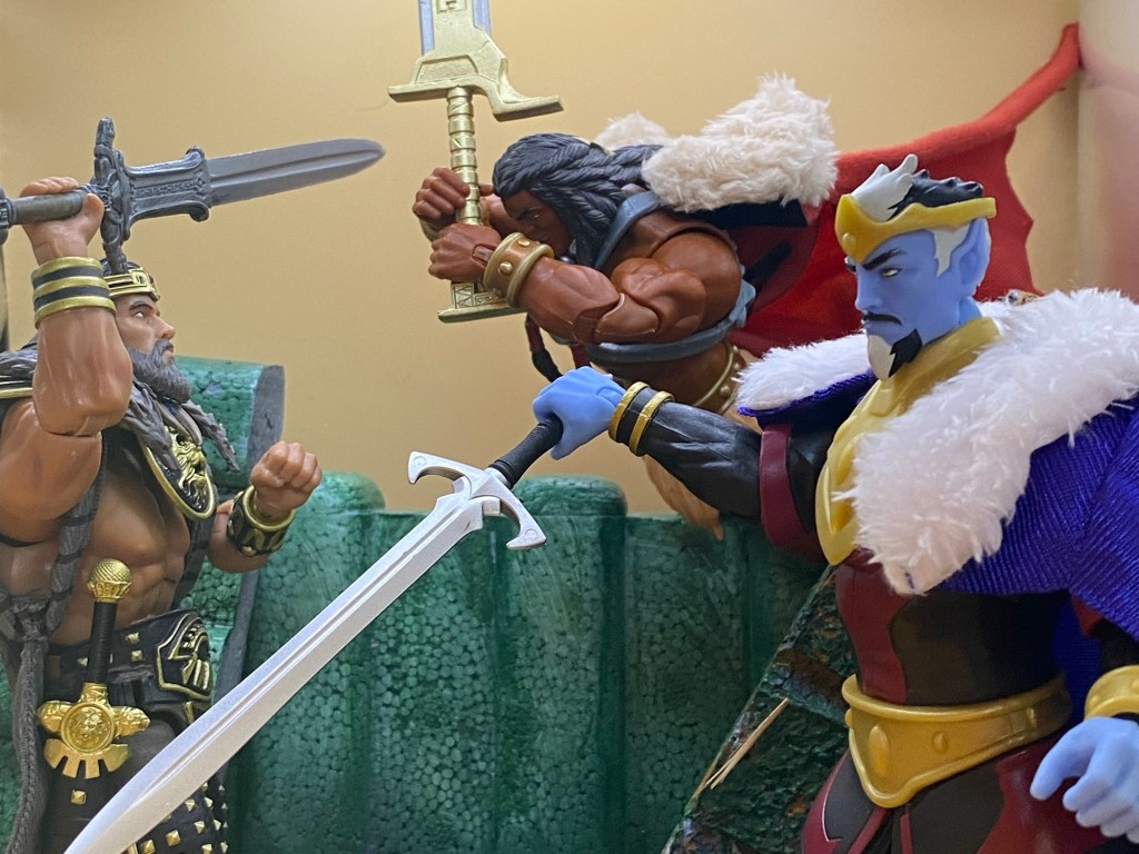 King Grayskull attacks King Conan with Khotal Kahn’s sword, who blocks with the Sword of Aquilonia. Keldor is ready to take advantage and chop his arm from underneath.