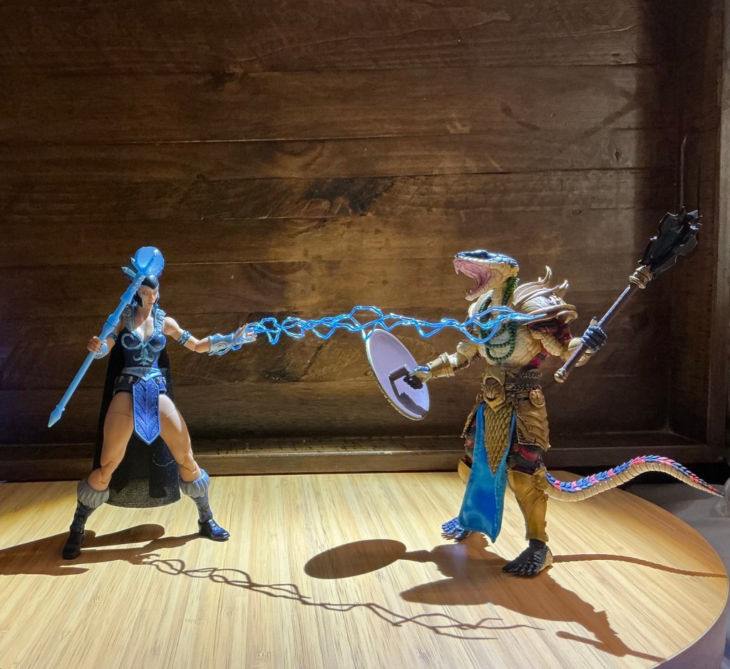 This figure is so photogenic. The Meso-American styling is creative and unexpected. With snake men, my first thought is “green.” Which is pretty stupid when you think about it. Most of the Masters of the Universe snake men are fairly colorful.