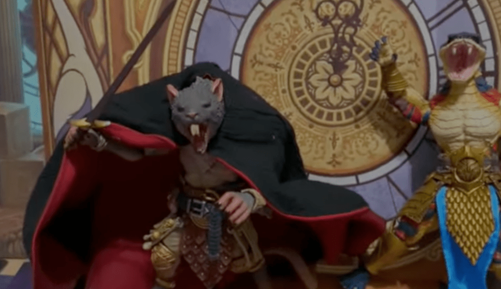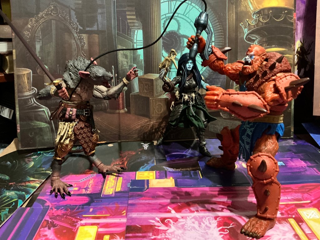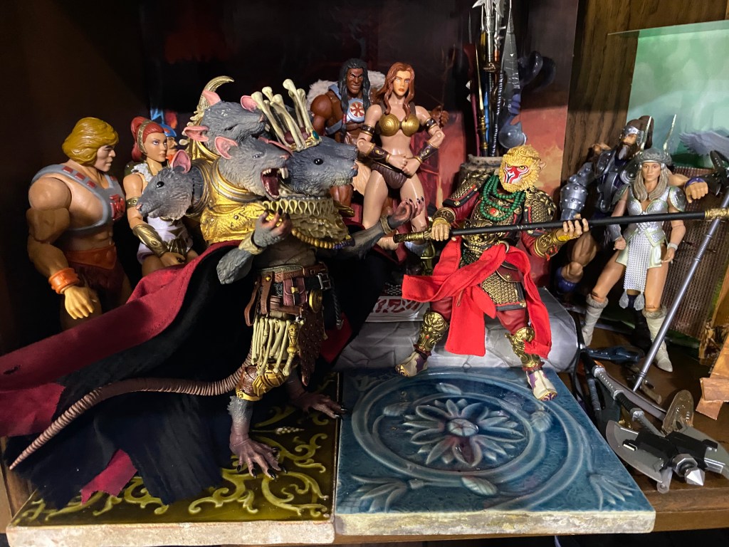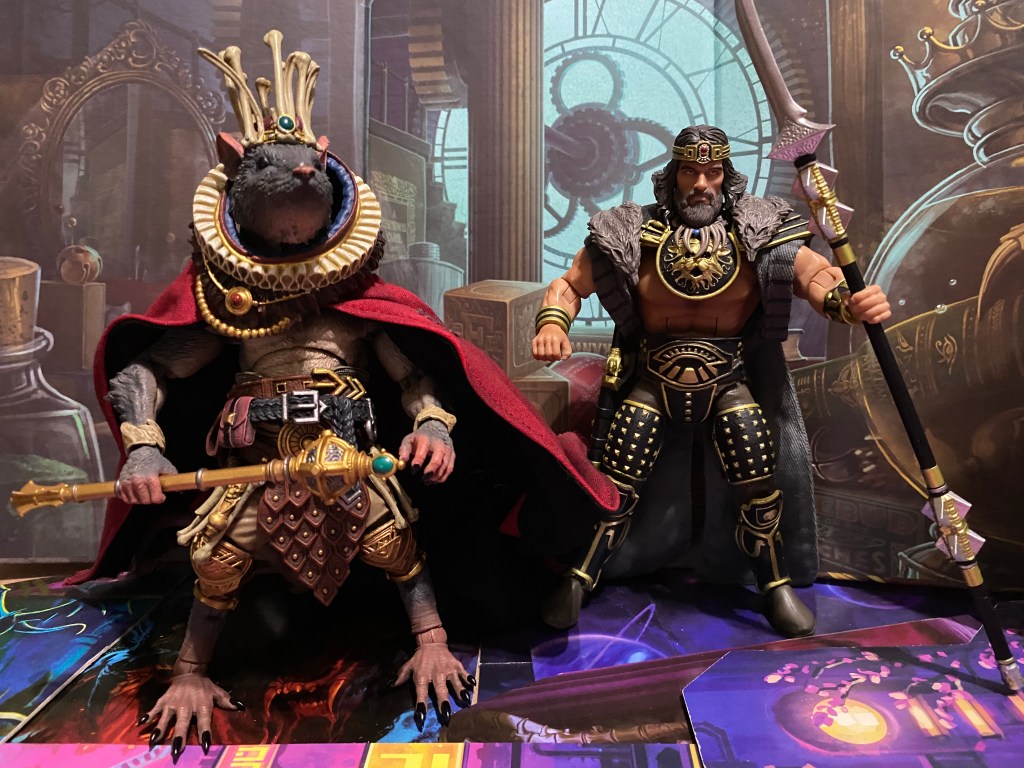 PICTURED: Figuara Obscura The Mouse King and Super7 Ultimates! King Conan. Both are doing battle to see who the real king is. If you look close, you can see the Mouse King has a stripe of blood on his face. And King Conan’s gigantic sword is dripping with blood.