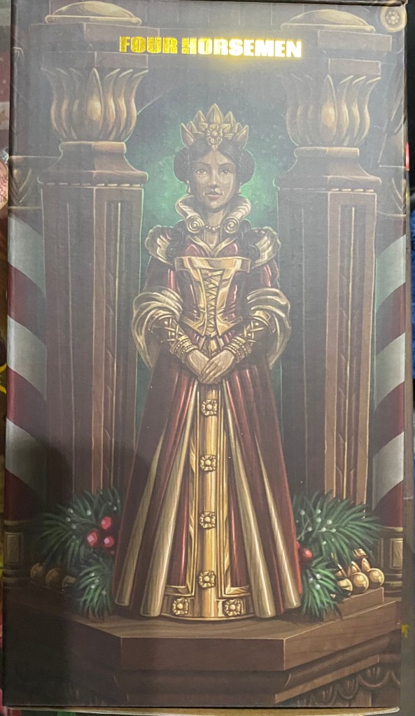 On the inside box you have a picture of the Nutcracker and some lady I don’t remember. I’m pretty sure she isn’t the girl having the dream, as that is a child. So I don’t know who this is. One thing about the Four Horsemen showing us this picture…it is taking away some of the mystery of how they might design a Nutcracker to pit against the Mouse King in the future. On the other hand, Nutcrackers are easy to come by, especially in this size and scale, while Mouse Kings are usually missing in action. (Other fantasy villains for Christmas, right? Krampus. The Grinch. Jack Skellington.)
