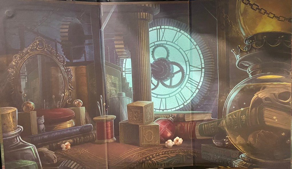 The capper has a backdrop on the other side, giving us a scene inside a grandfather clock. Apparently the Mouse King’s lair. He has a little throne made from a compact mirror and some makeup items. There are books, some kind of snake or cat skull, giving us some context of some of the king’s past victories maybe, and an oil lamp.