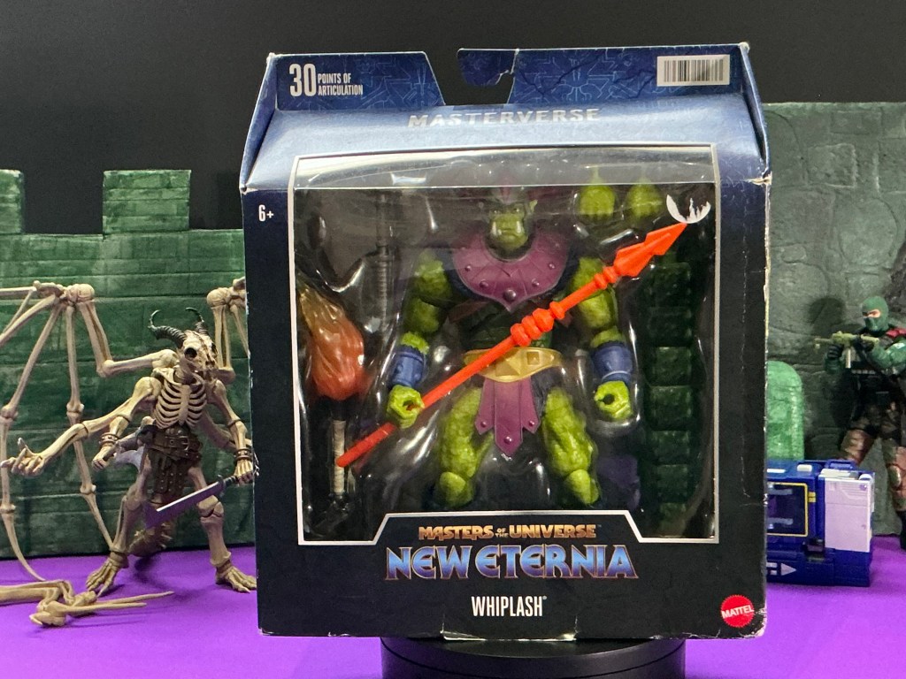 PICTURED: New Eternia Whiplash in box. this box shows evidence of damage. Also we can see recently reviewed figures, Mythic Legions Terpiculi, Transformers Studio Series Soundwave, and GI Joe Classified Series Retro Cardback Beach Head.