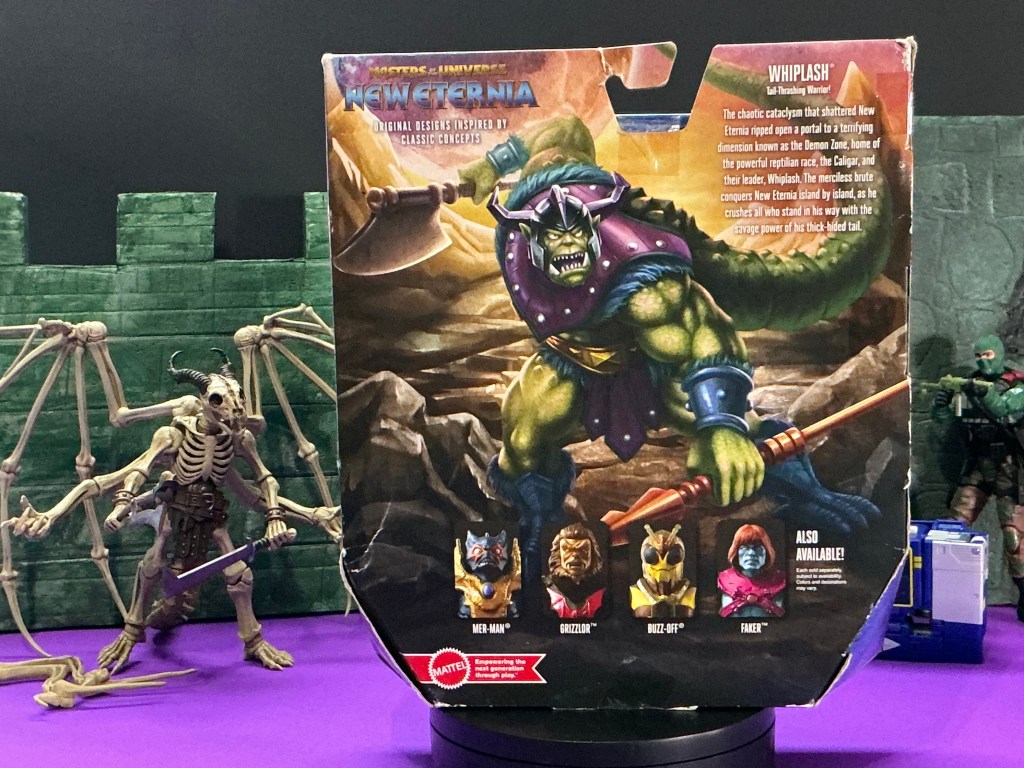 The back shows Whiplash in New Eternia action with excellent art that reminds me of the art we got with the New Eternia Clawful, which is to say…awesome stuff that the line has been lacking for a few years. The bio reminds us that Whiplash is of the Caligar race, but also gives us a new dimension know as “The Demon Zone.”