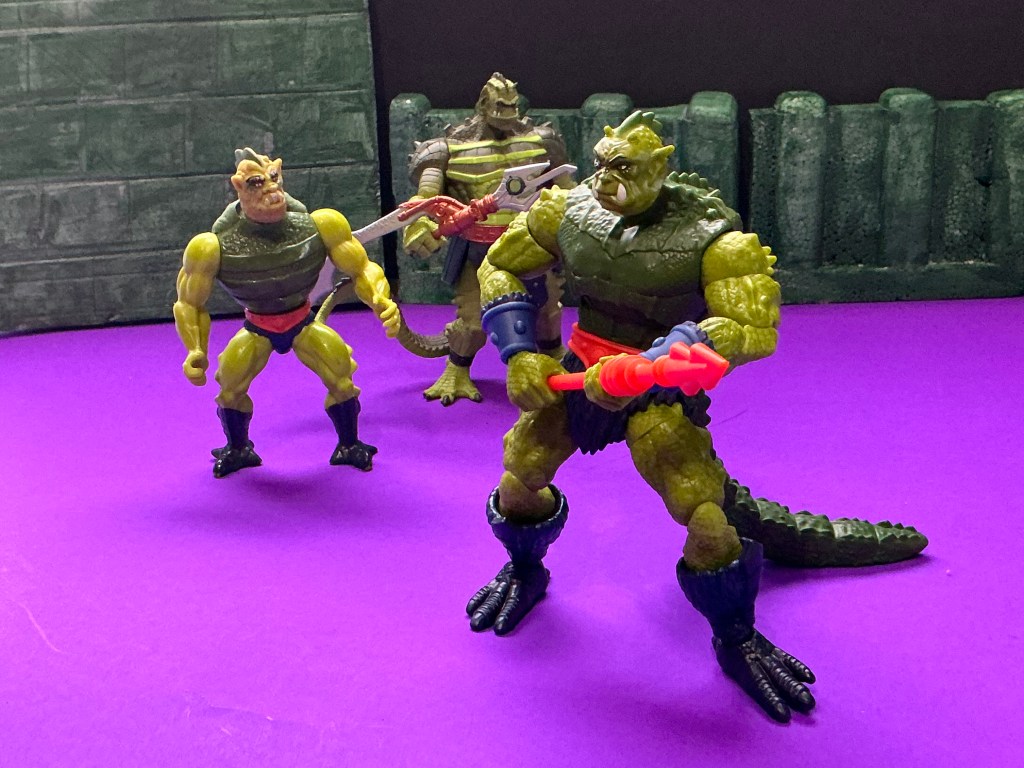 PICTURED: MASTERVERSE New Eternia Whiplash, Vintage Masters of the Universe Whiplash, and 200x Masters of the Universe Whiplash.