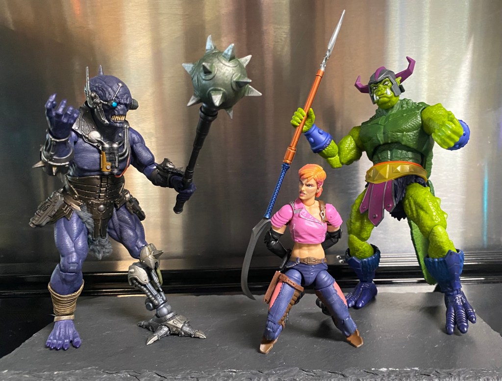 So, once again…the Mythic (Cosmic) Legions is clearly MORE incredible than the MASTERVERSE figure. We have to set that aside, however and be subjective for one. SSKURGGE is not the same person as Whiplash. And this is a real difference. He isn’t “The Real Slim Shady,) only a copycat. You should watch my video as I do headswaps and get cracked up…it is pretty funny. Otherwise, these guys are the exact same colors of green. (Find the review of SSKURGGE here).