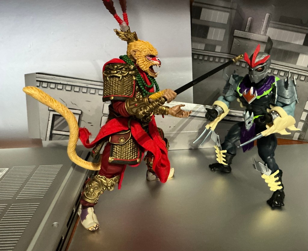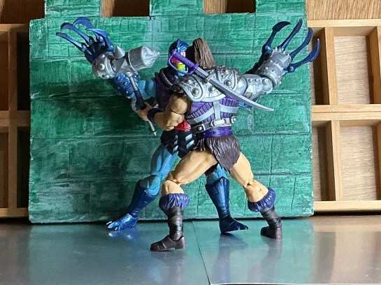 His sculpt and paint are very good. There are dragon details at the top of each terror claw, as well as the classic skull on his armor, but this time kind of cybernetic looking. The armor is what some people like to compare to a crop-top or sports bra…and I agree with joking about that! But it looks like the vintage design. The helmet is kind of a football helmet with spikes running up the mohawk. His feet have metal boots covering monster feet. There is this glossy blue, purple, and silver paint all over the figure, with the same pale blue that BA Skeletor has. I think the paint is one of the best features of this figure. The red belt also compliments red evil eyes that always work for Skeletor.