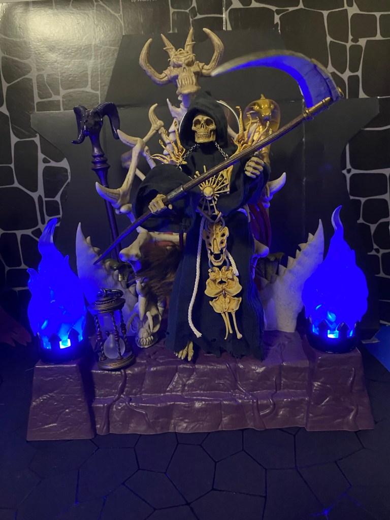 Am I Evil”. PICTURED: Mythic Legions Maxillius the Harvester on MASTERVERSE New Eternia Skeletor’s throne. (Also called bone throne, and Havoc throne.)