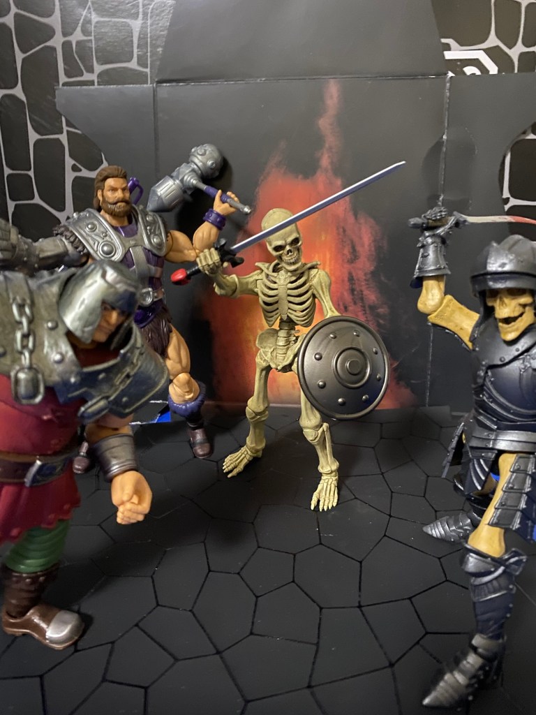 PICTURED: MASTERVERSE New Eternia Fisto and Ram Man vs. Mythic Legions Maxillius the Harvester and Skeleton Legion Builder Reinforcement. They fight MASTERVERSE New Eternia Ram Man and Fisto. Maxillius is armed with Masters of the Universe Classics Despara sword and MASTERVERSE New Eternia Skelcon shield, while Skeleton Reinforcement is armed with Super7 Ultimates Battle of the Mounds bloody weapons short sword. I understand that in D&D, to beat skeletons you should use hammers and blunt weapons. So metal fist and rammy head…