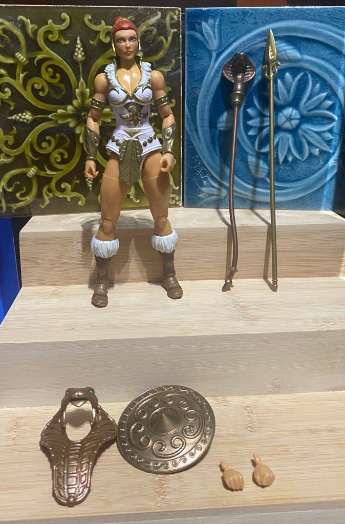 She comes with a cardboard “footlocker” setup similar to Sgt. Slaughter. Accessories include: