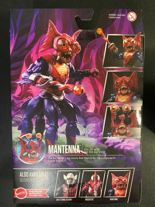 The back shows a photoshop of the toy, with what might be the Whispering Woods in the background. Mantenna is searching for pieces of Castle Greyskull. Interesting!