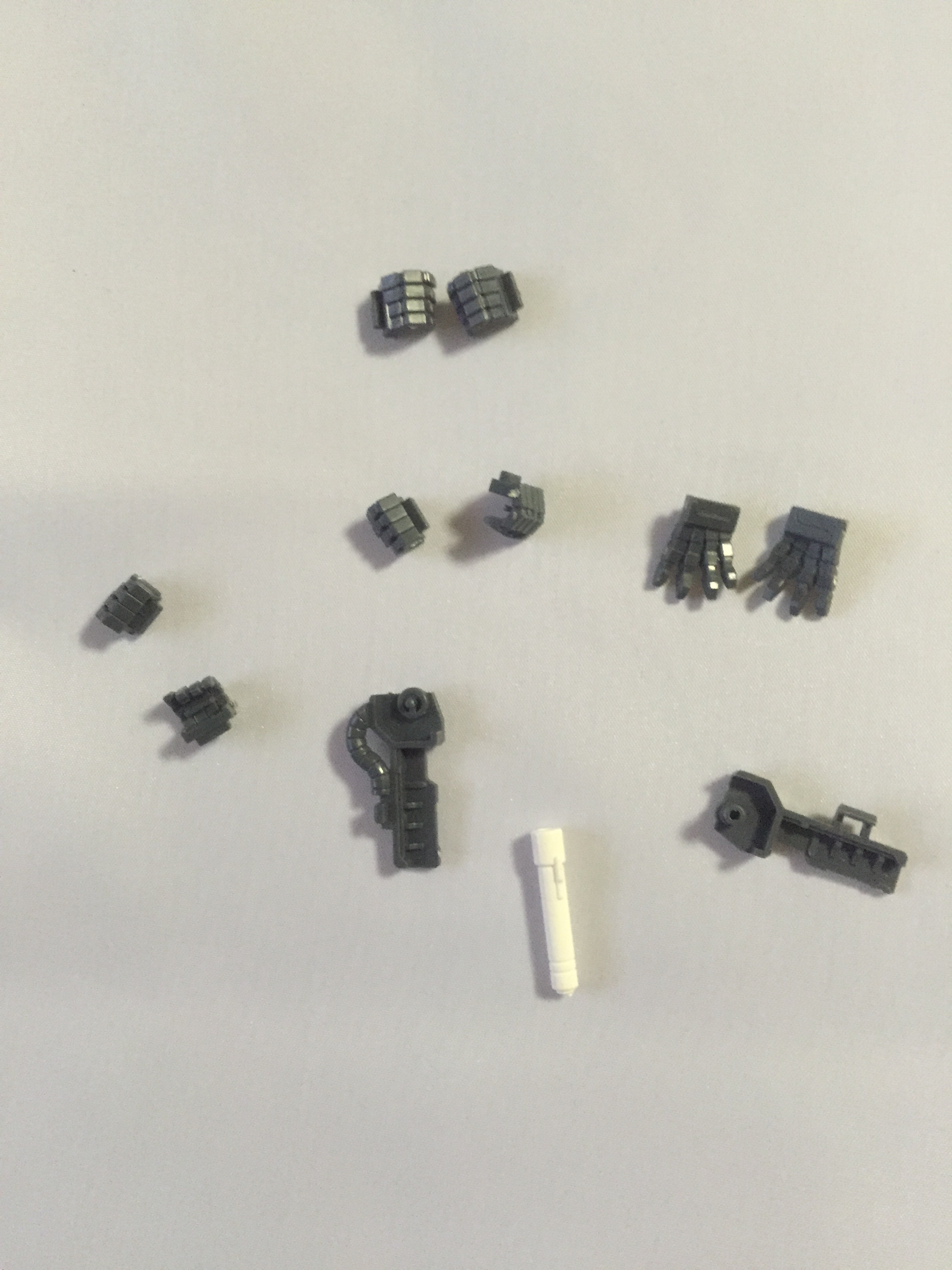 Here are most of the accessories. I say most, because, the Grenade Launcher/Shotgun wasn’t ready at the time of the review. Notice the “beam-effect” parts. These are interchangeable with the axe, and with the shield.