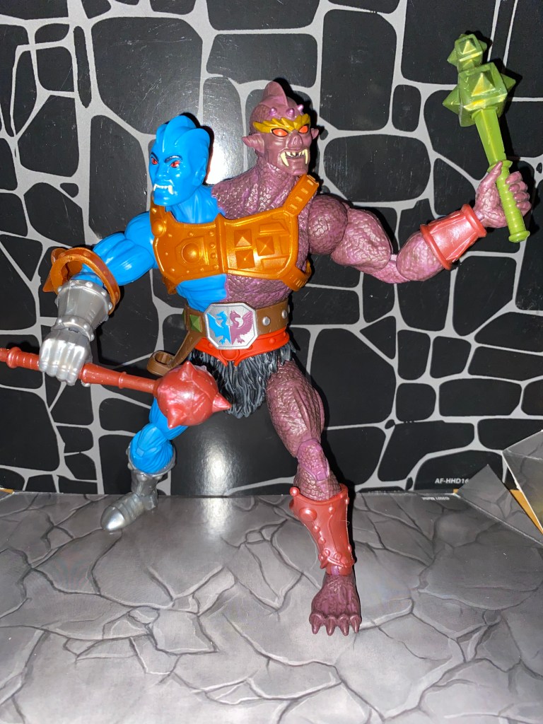 I am in favor of the 200x design, where were two characters (Tuvar and Baddrah) merged into one body by Skeletor as punishment for allowing their own personal rivalry to botch the capture of He-Man. If you read the bio on the back of this package, the responsibility for them being merged is on themselves, as they were stealing some treasure that mutated them.